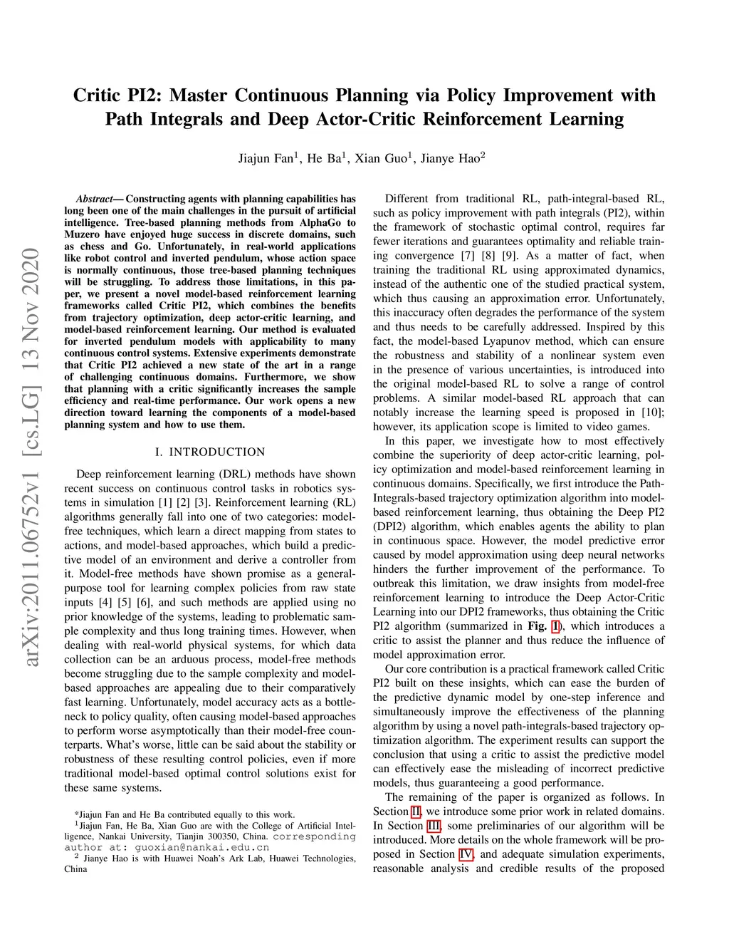 Constructing agents with planning capabilities has long been one of the main challenges in the pursuit of artificial intelligence. Tree-based planning methods from AlphaGo to Muzero have enjoyed huge success in discrete domains, such as chess and Go. Unfortunately, in real-world applications like robot control and inverted pendulum, whose action space is normally continuous, those tree-based planning techniques will be struggling. To address those limitations, in this paper, we present a novel model-based reinforcement learning frameworks called Critic PI2, which combines the benefits from trajectory optimization, deep actor-critic learning, and model-based reinforcement learning. Our method is evaluated for inverted pendulum models with applicability to many continuous control systems. Extensive experiments demonstrate that Critic PI2 achieved a new state of the art in a range of challenging continuous domains. Furthermore, we show that planning with a critic significantly increases the sample efficiency and real-time performance. Our work opens a new direction toward learning the components of a model-based planning system and how to use them.