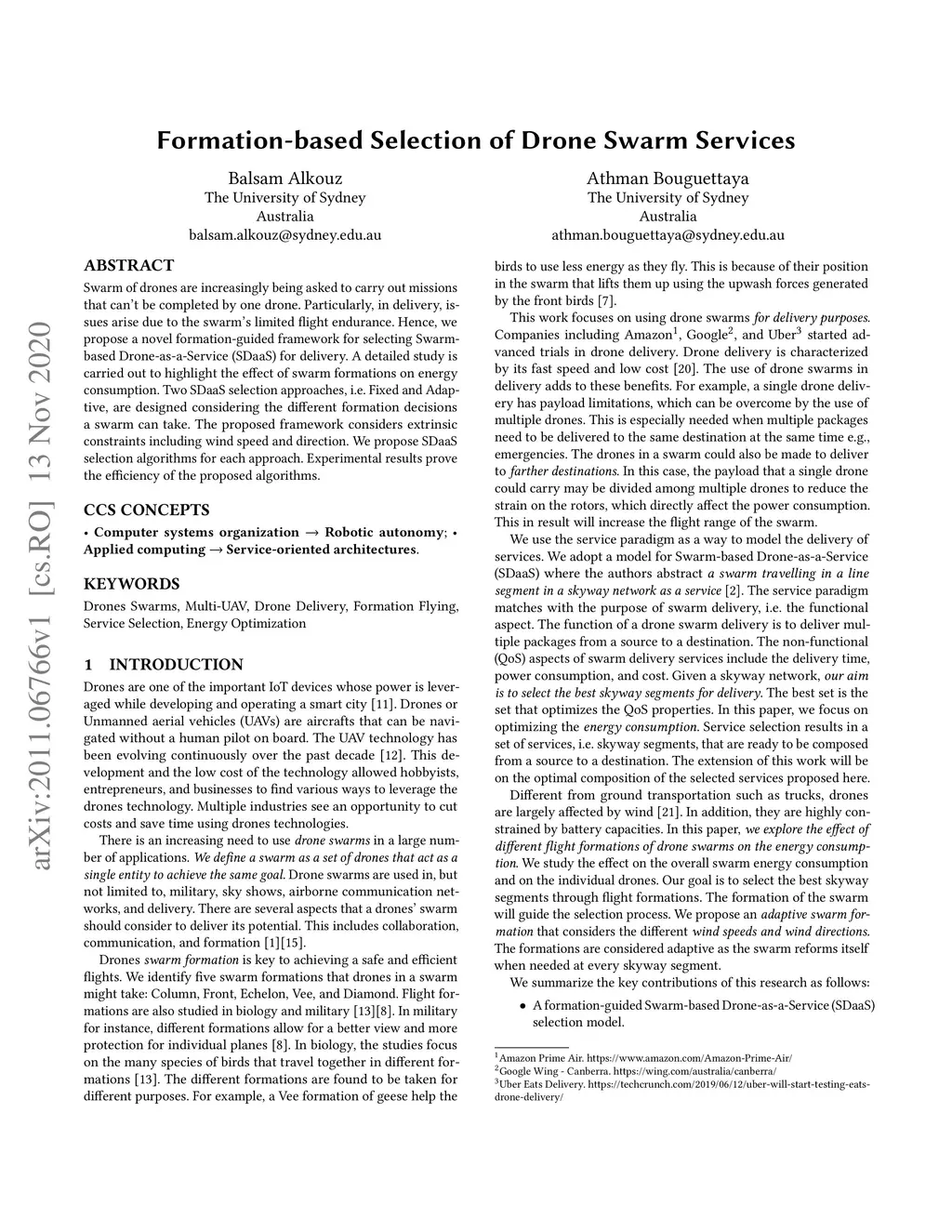 Swarm of drones are increasingly being asked to carry out missions that can't be completed by one drone. Particularly, in delivery, issues arise due to the swarm's limited flight endurance. Hence, we propose a novel formation-guided framework for selecting Swarm-based Drone-as-a-Service (SDaaS) for delivery. A detailed study is carried out to highlight the effect of swarm formations on energy consumption. Two SDaaS selection approaches, i.e. Fixed and Adaptive, are designed considering the different formation decisions a swarm can take. The proposed framework considers extrinsic constraints including wind speed and direction. We propose SDaaS selection algorithms for each approach. Experimental results prove the efficiency of the proposed algorithms.