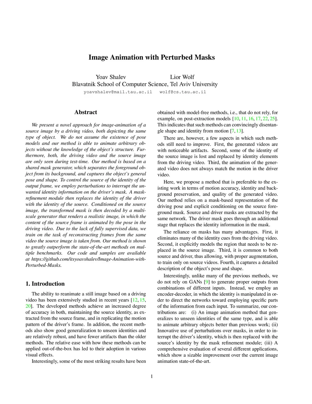 We present a novel approach for image-animation of a source image by a driving video, both depicting the same type of object. We do not assume the existence of pose models and our method is able to animate arbitrary objects without the knowledge of the object's structure. Furthermore, both, the driving video and the source image are only seen during test-time. Our method is based on a shared mask generator, which separates the foreground object from its background, and captures the object's general pose and shape. To control the source of the identity of the output frame, we employ perturbations to interrupt the unwanted identity information on the driver's mask. A mask-refinement module then replaces the identity of the driver with the identity of the source. Conditioned on the source image, the transformed mask is then decoded by a multi-scale generator that renders a realistic image, in which the content of the source frame is animated by the pose in the driving video. Due to the lack of fully supervised data, we train on the task of reconstructing frames from the same video the source image is taken from. Our method is shown to greatly outperform the state-of-the-art methods on multiple benchmarks. Our code and samples are available at https://github.com/itsyoavshalev/Image-Animation-with-Perturbed-Masks.