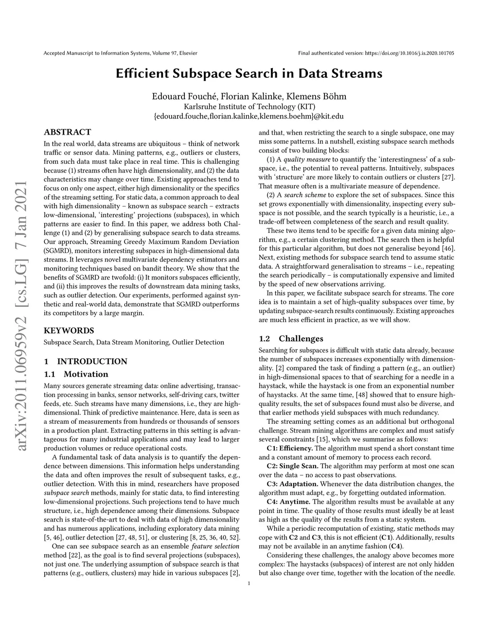 In the real world, data streams are ubiquitous -- think of network traffic or sensor data. Mining patterns, e.g., outliers or clusters, from such data must take place in real time. This is challenging because (1) streams often have high dimensionality, and (2) the data characteristics may change over time. Existing approaches tend to focus on only one aspect, either high dimensionality or the specifics of the streaming setting. For static data, a common approach to deal with high dimensionality -- known as subspace search -- extracts low-dimensional, `interesting' projections (subspaces), in which patterns are easier to find. In this paper, we address both Challenge (1) and (2) by generalising subspace search to data streams. Our approach, Streaming Greedy Maximum Random Deviation (SGMRD), monitors interesting subspaces in high-dimensional data streams. It leverages novel multivariate dependency estimators and monitoring techniques based on bandit theory. We show that the benefits of SGMRD are twofold: (i) It monitors subspaces efficiently, and (ii) this improves the results of downstream data mining tasks, such as outlier detection. Our experiments, performed against synthetic and real-world data, demonstrate that SGMRD outperforms its competitors by a large margin.
