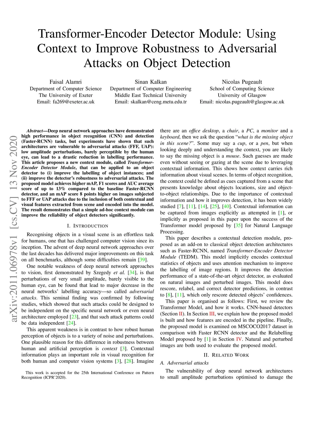 Deep neural network approaches have demonstrated high performance in object recognition (CNN) and detection (Faster-RCNN) tasks, but experiments have shown that such architectures are vulnerable to adversarial attacks (FFF, UAP): low amplitude perturbations, barely perceptible by the human eye, can lead to a drastic reduction in labeling performance. This article proposes a new context module, called \textit{Transformer-Encoder Detector Module}, that can be applied to an object detector to (i) improve the labeling of object instances; and (ii) improve the detector's robustness to adversarial attacks. The proposed model achieves higher mAP, F1 scores and AUC average score of up to 13\% compared to the baseline Faster-RCNN detector, and an mAP score 8 points higher on images subjected to FFF or UAP attacks due to the inclusion of both contextual and visual features extracted from scene and encoded into the model. The result demonstrates that a simple ad-hoc context module can improve the reliability of object detectors significantly.