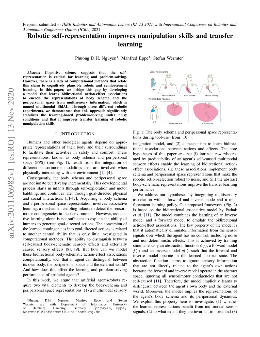 Cognitive science suggests that the self-representation is critical for learning and problem-solving. However, there is a lack of computational methods that relate this claim to cognitively plausible robots and reinforcement learning. In this paper, we bridge this gap by developing a model that learns bidirectional action-effect associations to encode the representations of body schema and the peripersonal space from multisensory information, which is named multimodal BidAL. Through three different robotic experiments, we demonstrate that this approach significantly stabilizes the learning-based problem-solving under noisy conditions and that it improves transfer learning of robotic manipulation skills.