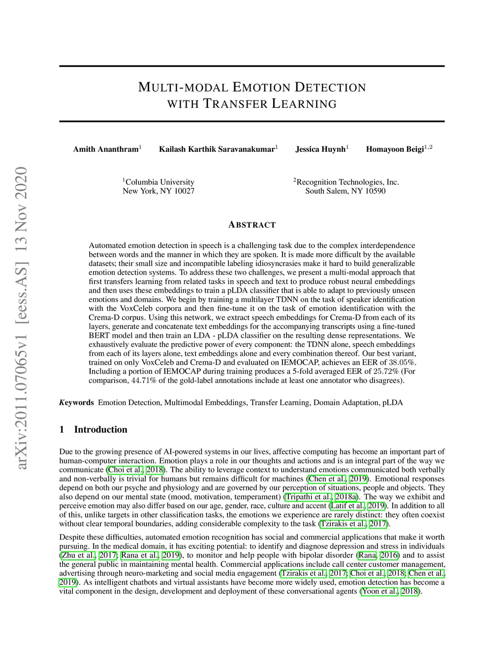 Automated emotion detection in speech is a challenging task due to the complex interdependence between words and the manner in which they are spoken. It is made more difficult by the available datasets; their small size and incompatible labeling idiosyncrasies make it hard to build generalizable emotion detection systems. To address these two challenges, we present a multi-modal approach that first transfers learning from related tasks in speech and text to produce robust neural embeddings and then uses these embeddings to train a pLDA classifier that is able to adapt to previously unseen emotions and domains. We begin by training a multilayer TDNN on the task of speaker identification with the VoxCeleb corpora and then fine-tune it on the task of emotion identification with the Crema-D corpus. Using this network, we extract speech embeddings for Crema-D from each of its layers, generate and concatenate text embeddings for the accompanying transcripts using a fine-tuned BERT model and then train an LDA - pLDA classifier on the resulting dense representations. We exhaustively evaluate the predictive power of every component: the TDNN alone, speech embeddings from each of its layers alone, text embeddings alone and every combination thereof. Our best variant, trained on only VoxCeleb and Crema-D and evaluated on IEMOCAP, achieves an EER of 38.05%. Including a portion of IEMOCAP during training produces a 5-fold averaged EER of 25.72% (For comparison, 44.71% of the gold-label annotations include at least one annotator who disagrees).