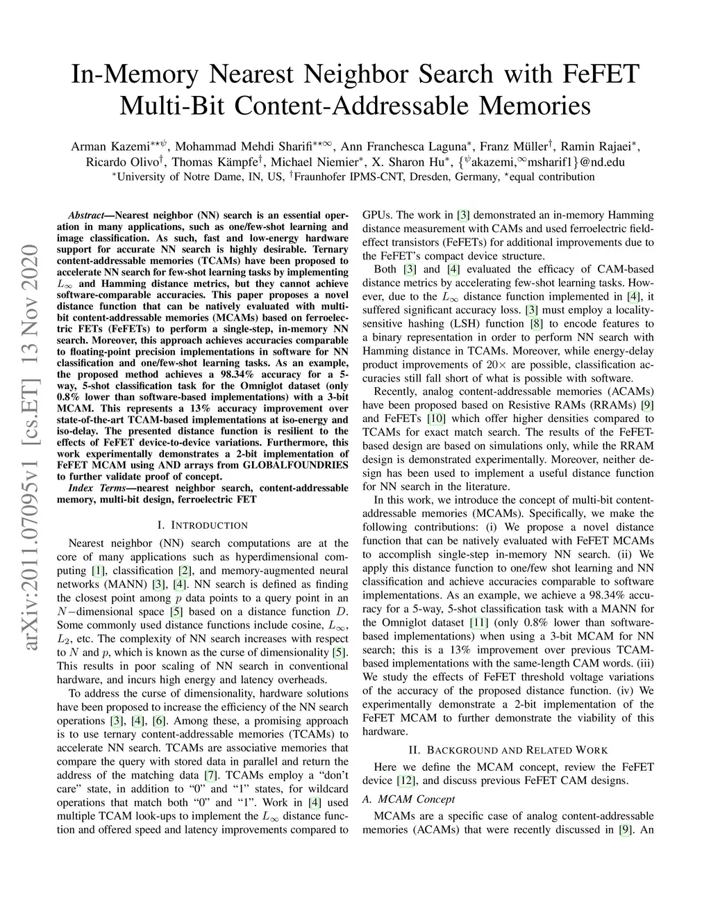 Nearest neighbor (NN) search is an essential operation in many applications, such as one/few-shot learning and image classification. As such, fast and low-energy hardware support for accurate NN search is highly desirable. Ternary content-addressable memories (TCAMs) have been proposed to accelerate NN search for few-shot learning tasks by implementing and Hamming distance metrics, but they cannot achieve software-comparable accuracies. This paper proposes a novel distance function that can be natively evaluated with multi-bit content-addressable memories (MCAMs) based on ferroelectric FETs (FeFETs) to perform a single-step, in-memory NN search. Moreover, this approach achieves accuracies comparable to floating-point precision implementations in software for NN classification and one/few-shot learning tasks. As an example, the proposed method achieves a 98.34% accuracy for a 5-way, 5-shot classification task for the Omniglot dataset (only 0.8% lower than software-based implementations) with a 3-bit MCAM. This represents a 13% accuracy improvement over state-of-the-art TCAM-based implementations at iso-energy and iso-delay. The presented distance function is resilient to the effects of FeFET device-to-device variations. Furthermore, this work experimentally demonstrates a 2-bit implementation of FeFET MCAM using AND arrays from GLOBALFOUNDRIES to further validate proof of concept.