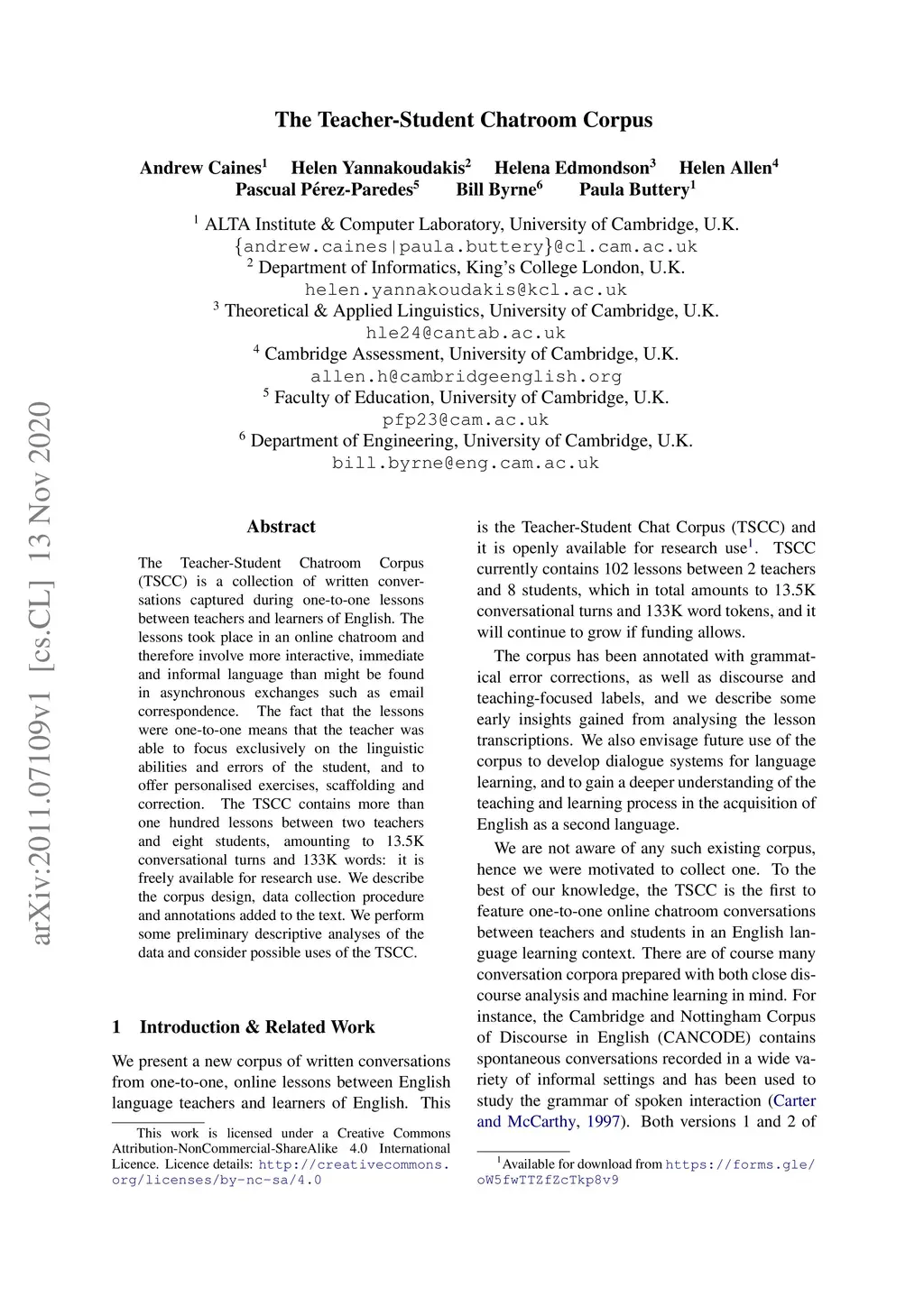 The Teacher-Student Chatroom Corpus (TSCC) is a collection of written conversations captured during one-to-one lessons between teachers and learners of English. The lessons took place in an online chatroom and therefore involve more interactive, immediate and informal language than might be found in asynchronous exchanges such as email correspondence. The fact that the lessons were one-to-one means that the teacher was able to focus exclusively on the linguistic abilities and errors of the student, and to offer personalised exercises, scaffolding and correction. The TSCC contains more than one hundred lessons between two teachers and eight students, amounting to 13.5K conversational turns and 133K words: it is freely available for research use. We describe the corpus design, data collection procedure and annotations added to the text. We perform some preliminary descriptive analyses of the data and consider possible uses of the TSCC.