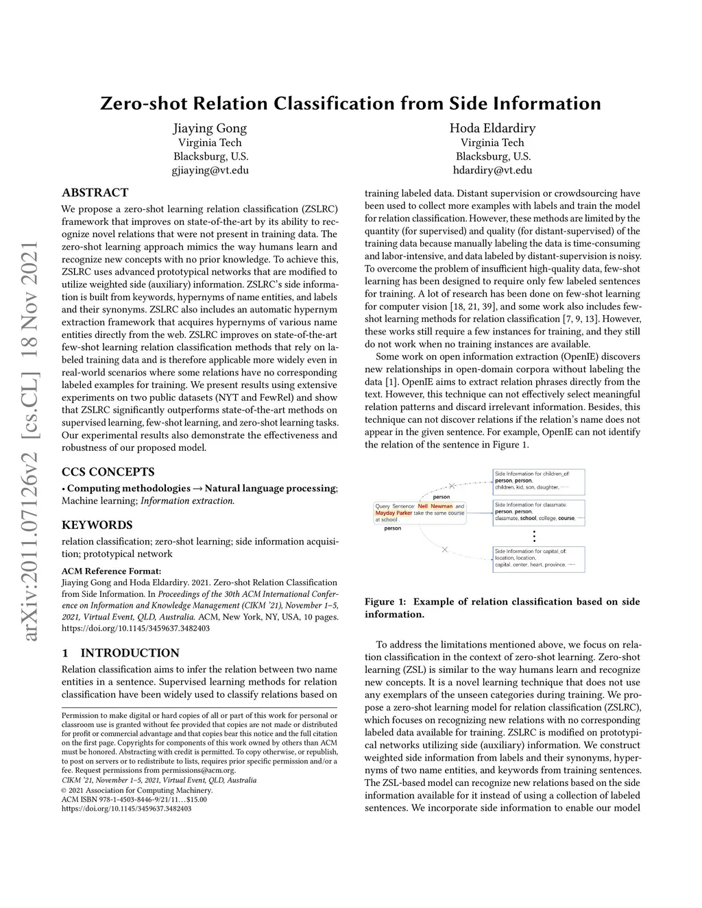 We propose a zero-shot learning relation classification (ZSLRC) framework that improves on state-of-the-art by its ability to recognize novel relations that were not present in training data. The zero-shot learning approach mimics the way humans learn and recognize new concepts with no prior knowledge. To achieve this, ZSLRC uses advanced prototypical networks that are modified to utilize weighted side (auxiliary) information. ZSLRC's side information is built from keywords, hypernyms of name entities, and labels and their synonyms. ZSLRC also includes an automatic hypernym extraction framework that acquires hypernyms of various name entities directly from the web. ZSLRC improves on state-of-the-art few-shot learning relation classification methods that rely on labeled training data and is therefore applicable more widely even in real-world scenarios where some relations have no corresponding labeled examples for training. We present results using extensive experiments on two public datasets (NYT and FewRel) and show that ZSLRC significantly outperforms state-of-the-art methods on supervised learning, few-shot learning, and zero-shot learning tasks. Our experimental results also demonstrate the effectiveness and robustness of our proposed model.