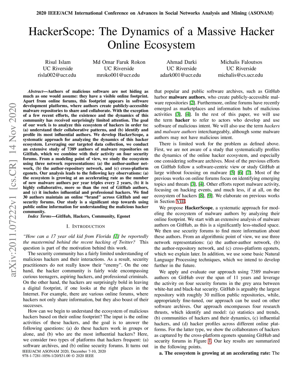Authors of malicious software are not hiding as much as one would assume: they have a visible online footprint. Apart from online forums, this footprint appears in software development platforms, where authors create publicly-accessible malware repositories to share and collaborate. With the exception of a few recent efforts, the existence and the dynamics of this community has received surprisingly limited attention. The goal of our work is to analyze this ecosystem of hackers in order to: (a) understand their collaborative patterns, and (b) identify and profile its most influential authors. We develop HackerScope, a systematic approach for analyzing the dynamics of this hacker ecosystem. Leveraging our targeted data collection, we conduct an extensive study of 7389 authors of malware repositories on GitHub, which we combine with their activity on four security forums. From a modeling point of view, we study the ecosystem using three network representations: (a) the author-author network, (b) the author-repository network, and (c) cross-platform egonets. Our analysis leads to the following key observations: (a) the ecosystem is growing at an accelerating rate as the number of new malware authors per year triples every 2 years, (b) it is highly collaborative, more so than the rest of GitHub authors, and (c) it includes influential and professional hackers. We find 30 authors maintain an online "brand" across GitHub and our security forums. Our study is a significant step towards using public online information for understanding the malicious hacker community.