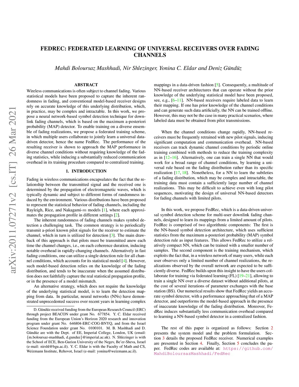FedRec: Federated Learning of Universal Receivers over Fading Channels