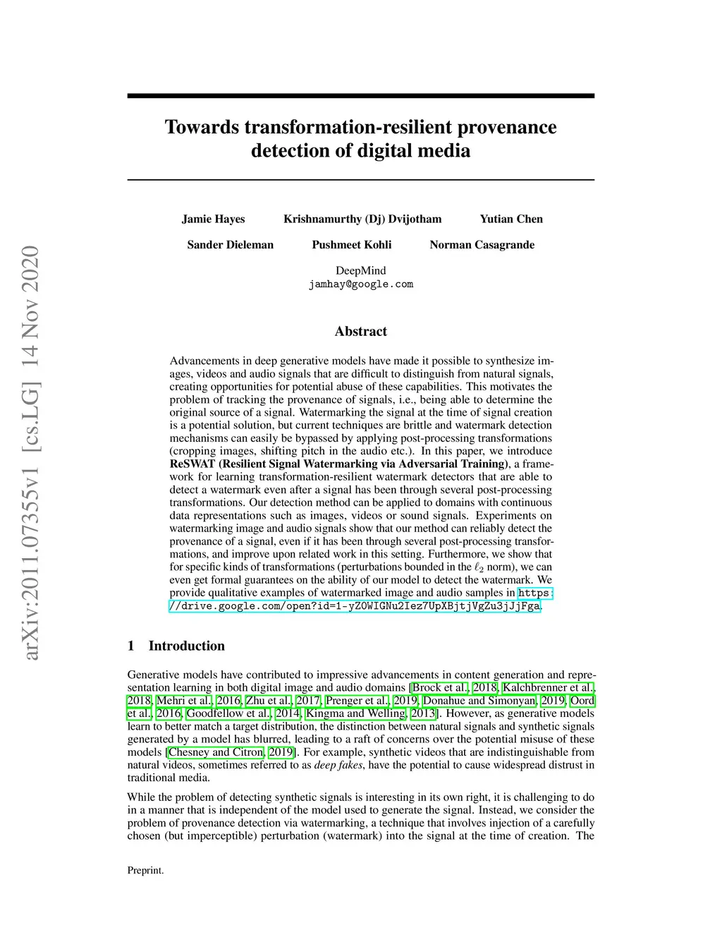Advancements in deep generative models have made it possible to synthesize images, videos and audio signals that are difficult to distinguish from natural signals, creating opportunities for potential abuse of these capabilities. This motivates the problem of tracking the provenance of signals, i.e., being able to determine the original source of a signal. Watermarking the signal at the time of signal creation is a potential solution, but current techniques are brittle and watermark detection mechanisms can easily be bypassed by applying post-processing transformations (cropping images, shifting pitch in the audio etc.). In this paper, we introduce ReSWAT (Resilient Signal Watermarking via Adversarial Training), a framework for learning transformation-resilient watermark detectors that are able to detect a watermark even after a signal has been through several post-processing transformations. Our detection method can be applied to domains with continuous data representations such as images, videos or sound signals. Experiments on watermarking image and audio signals show that our method can reliably detect the provenance of a signal, even if it has been through several post-processing transformations, and improve upon related work in this setting. Furthermore, we show that for specific kinds of transformations (perturbations bounded in the L2 norm), we can even get formal guarantees on the ability of our model to detect the watermark. We provide qualitative examples of watermarked image and audio samples in https://drive.google.com/open?id=1-yZ0WIGNu2Iez7UpXBjtjVgZu3jJjFga.