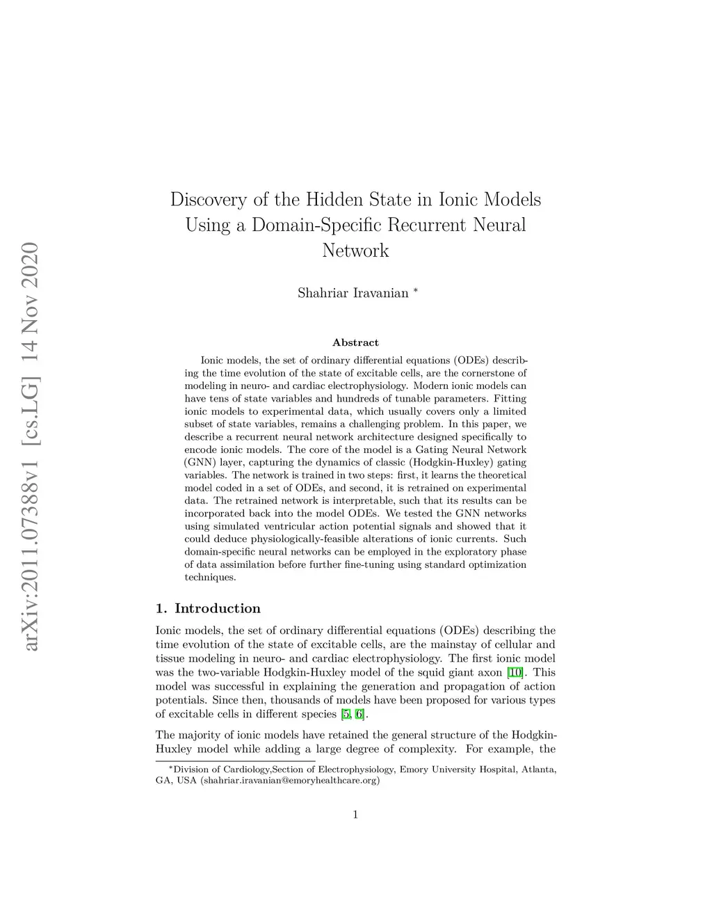 Ionic models, the set of ordinary differential equations (ODEs) describing the time evolution of the state of excitable cells, are the cornerstone of modeling in neuro- and cardiac electrophysiology. Modern ionic models can have tens of state variables and hundreds of tunable parameters. Fitting ionic models to experimental data, which usually covers only a limited subset of state variables, remains a challenging problem. In this paper, we describe a recurrent neural network architecture designed specifically to encode ionic models. The core of the model is a Gating Neural Network (GNN) layer, capturing the dynamics of classic (Hodgkin-Huxley) gating variables. The network is trained in two steps: first, it learns the theoretical model coded in a set of ODEs, and second, it is retrained on experimental data. The retrained network is interpretable, such that its results can be incorporated back into the model ODEs. We tested the GNN networks using simulated ventricular action potential signals and showed that it could deduce physiologically-feasible alterations of ionic currents. Such domain-specific neural networks can be employed in the exploratory phase of data assimilation before further fine-tuning using standard optimization techniques.