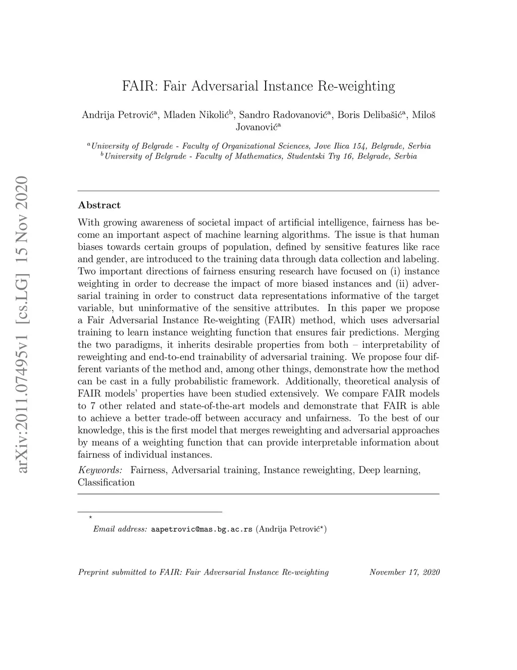 With growing awareness of societal impact of artificial intelligence, fairness has become an important aspect of machine learning algorithms. The issue is that human biases towards certain groups of population, defined by sensitive features like race and gender, are introduced to the training data through data collection and labeling. Two important directions of fairness ensuring research have focused on (i) instance weighting in order to decrease the impact of more biased instances and (ii) adversarial training in order to construct data representations informative of the target variable, but uninformative of the sensitive attributes. In this paper we propose a Fair Adversarial Instance Re-weighting (FAIR) method, which uses adversarial training to learn instance weighting function that ensures fair predictions. Merging the two paradigms, it inherits desirable properties from both -- interpretability of reweighting and end-to-end trainability of adversarial training. We propose four different variants of the method and, among other things, demonstrate how the method can be cast in a fully probabilistic framework. Additionally, theoretical analysis of FAIR models' properties have been studied extensively. We compare FAIR models to 7 other related and state-of-the-art models and demonstrate that FAIR is able to achieve a better trade-off between accuracy and unfairness. To the best of our knowledge, this is the first model that merges reweighting and adversarial approaches by means of a weighting function that can provide interpretable information about fairness of individual instances.