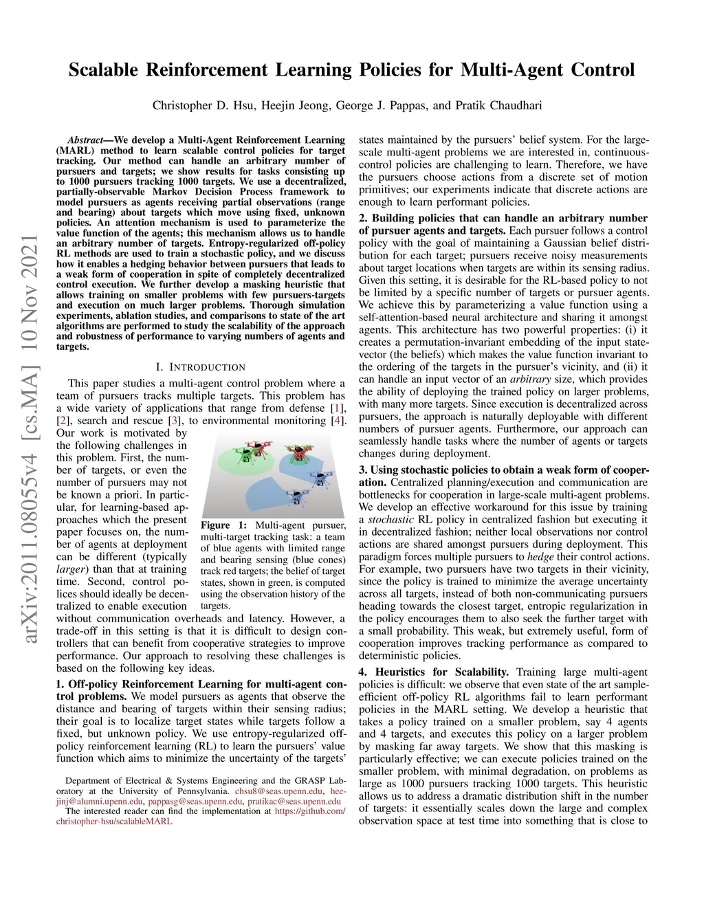 We develop a Multi-Agent Reinforcement Learning (MARL) method to learn scalable control policies for target tracking. Our method can handle an arbitrary number of pursuers and targets; we show results for tasks consisting up to 1000 pursuers tracking 1000 targets. We use a decentralized, partially-observable Markov Decision Process framework to model pursuers as agents receiving partial observations (range and bearing) about targets which move using fixed, unknown policies. An attention mechanism is used to parameterize the value function of the agents; this mechanism allows us to handle an arbitrary number of targets. Entropy-regularized off-policy RL methods are used to train a stochastic policy, and we discuss how it enables a hedging behavior between pursuers that leads to a weak form of cooperation in spite of completely decentralized control execution. We further develop a masking heuristic that allows training on smaller problems with few pursuers-targets and execution on much larger problems. Thorough simulation experiments, ablation studies, and comparisons to state of the art algorithms are performed to study the scalability of the approach and robustness of performance to varying numbers of agents and targets.