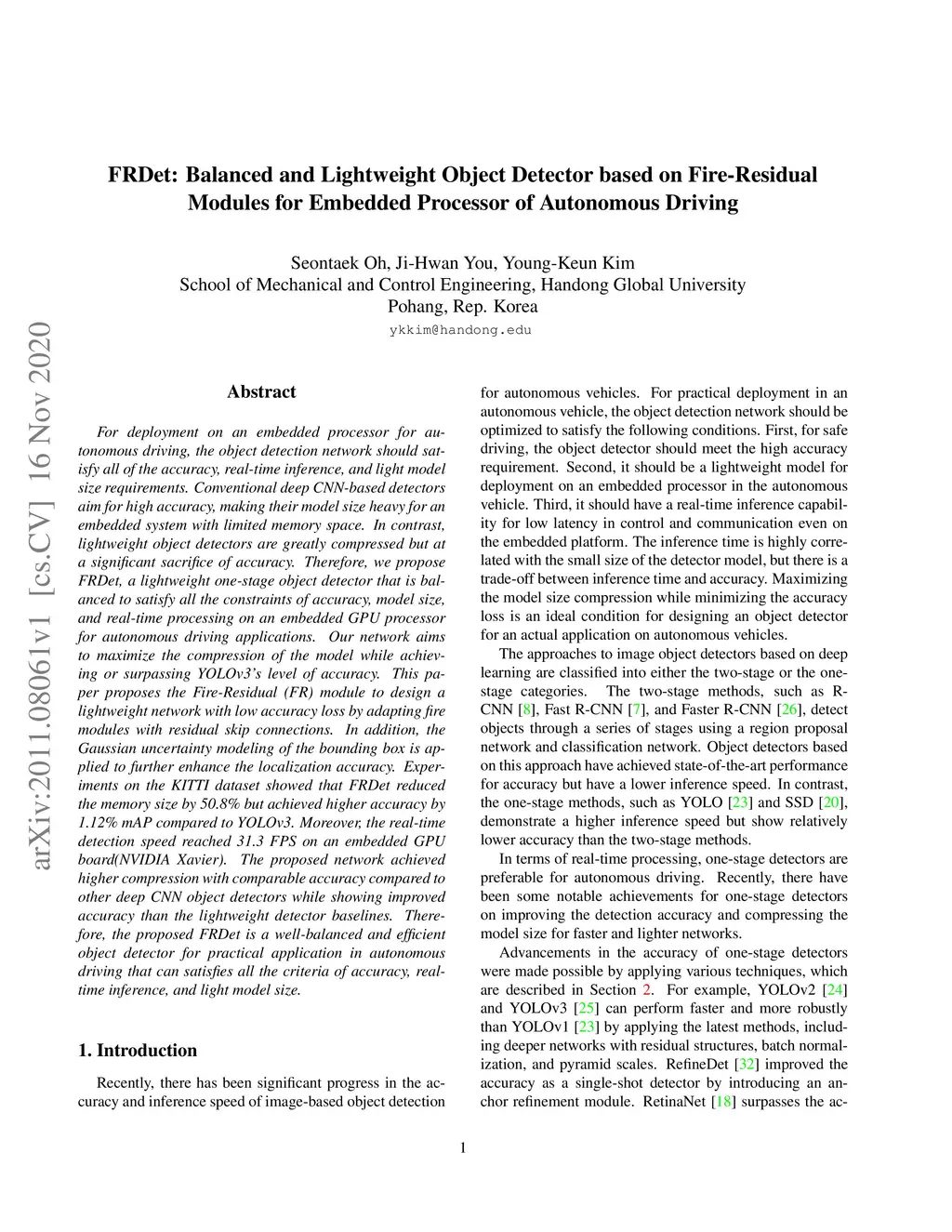 For deployment on an embedded processor for autonomous driving, the object detection network should satisfy all of the accuracy, real-time inference, and light model size requirements. Conventional deep CNN-based detectors aim for high accuracy, making their model size heavy for an embedded system with limited memory space. In contrast, lightweight object detectors are greatly compressed but at a significant sacrifice of accuracy. Therefore, we propose FRDet, a lightweight one-stage object detector that is balanced to satisfy all the constraints of accuracy, model size, and real-time processing on an embedded GPU processor for autonomous driving applications. Our network aims to maximize the compression of the model while achieving or surpassing YOLOv3 level of accuracy. This paper proposes the Fire-Residual (FR) module to design a lightweight network with low accuracy loss by adapting fire modules with residual skip connections. In addition, the Gaussian uncertainty modeling of the bounding box is applied to further enhance the localization accuracy. Experiments on the KITTI dataset showed that FRDet reduced the memory size by 50.8% but achieved higher accuracy by 1.12% mAP compared to YOLOv3. Moreover, the real-time detection speed reached 31.3 FPS on an embedded GPU board(NVIDIA Xavier). The proposed network achieved higher compression with comparable accuracy compared to other deep CNN object detectors while showing improved accuracy than the lightweight detector baselines. Therefore, the proposed FRDet is a well-balanced and efficient object detector for practical application in autonomous driving that can satisfies all the criteria of accuracy, real-time inference, and light model size.