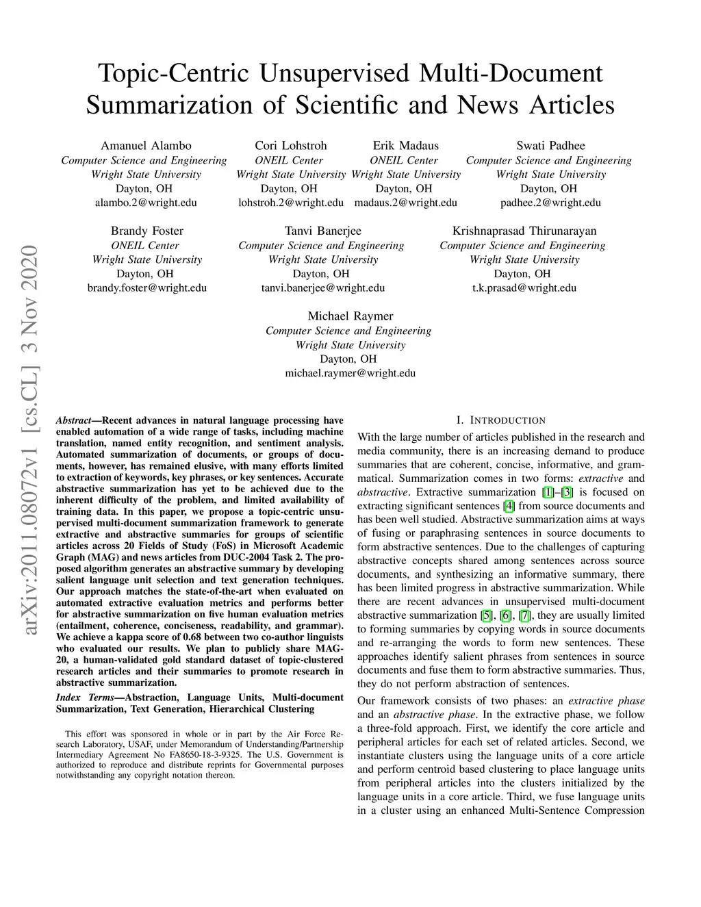 Recent advances in natural language processing have enabled automation of a wide range of tasks, including machine translation, named entity recognition, and sentiment analysis. Automated summarization of documents, or groups of documents, however, has remained elusive, with many efforts limited to extraction of keywords, key phrases, or key sentences. Accurate abstractive summarization has yet to be achieved due to the inherent difficulty of the problem, and limited availability of training data. In this paper, we propose a topic-centric unsupervised multi-document summarization framework to generate extractive and abstractive summaries for groups of scientific articles across 20 Fields of Study (FoS) in Microsoft Academic Graph (MAG) and news articles from DUC-2004 Task 2. The proposed algorithm generates an abstractive summary by developing salient language unit selection and text generation techniques. Our approach matches the state-of-the-art when evaluated on automated extractive evaluation metrics and performs better for abstractive summarization on five human evaluation metrics (entailment, coherence, conciseness, readability, and grammar). We achieve a kappa score of 0.68 between two co-author linguists who evaluated our results. We plan to publicly share MAG-20, a human-validated gold standard dataset of topic-clustered research articles and their summaries to promote research in abstractive summarization.
