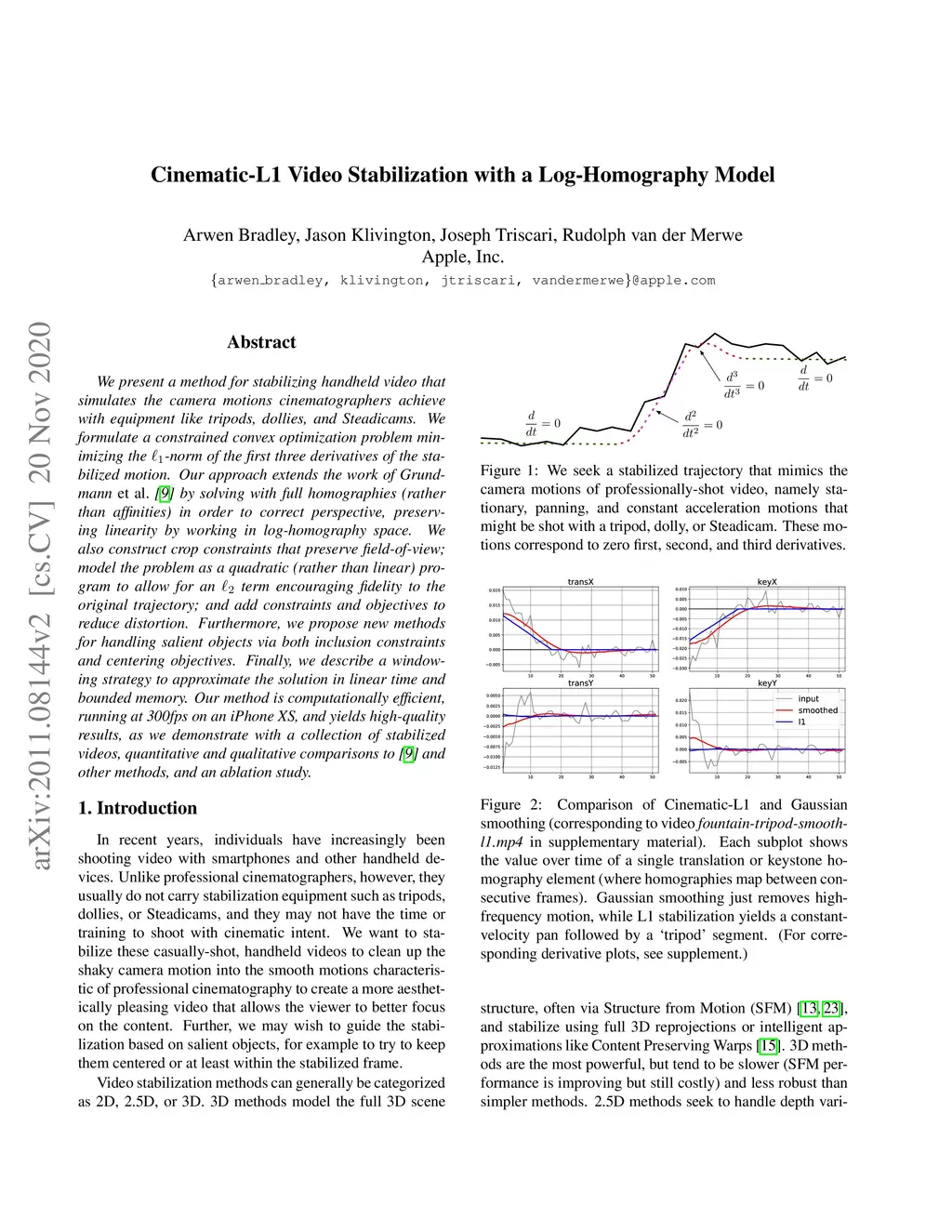 We present a method for stabilizing handheld video that simulates the camera motions cinematographers achieve with equipment like tripods, dollies, and Steadicams. We formulate a constrained convex optimization problem minimizing the -norm of the first three derivatives of the stabilized motion. Our approach extends the work of Grundmann et al. [9] by solving with full homographies (rather than affinities) in order to correct perspective, preserving linearity by working in log-homography space. We also construct crop constraints that preserve field-of-view; model the problem as a quadratic (rather than linear) program to allow for an term encouraging fidelity to the original trajectory; and add constraints and objectives to reduce distortion. Furthermore, we propose new methods for handling salient objects via both inclusion constraints and centering objectives. Finally, we describe a windowing strategy to approximate the solution in linear time and bounded memory. Our method is computationally efficient, running at 300fps on an iPhone XS, and yields high-quality results, as we demonstrate with a collection of stabilized videos, quantitative and qualitative comparisons to [9] and other methods, and an ablation study.