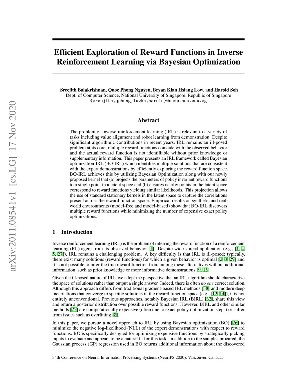 The problem of inverse reinforcement learning (IRL) is relevant to a variety of tasks including value alignment and robot learning from demonstration. Despite significant algorithmic contributions in recent years, IRL remains an ill-posed problem at its core; multiple reward functions coincide with the observed behavior and the actual reward function is not identifiable without prior knowledge or supplementary information. This paper presents an IRL framework called Bayesian optimization-IRL (BO-IRL) which identifies multiple solutions that are consistent with the expert demonstrations by efficiently exploring the reward function space. BO-IRL achieves this by utilizing Bayesian Optimization along with our newly proposed kernel that (a) projects the parameters of policy invariant reward functions to a single point in a latent space and (b) ensures nearby points in the latent space correspond to reward functions yielding similar likelihoods. This projection allows the use of standard stationary kernels in the latent space to capture the correlations present across the reward function space. Empirical results on synthetic and real-world environments (model-free and model-based) show that BO-IRL discovers multiple reward functions while minimizing the number of expensive exact policy optimizations.
