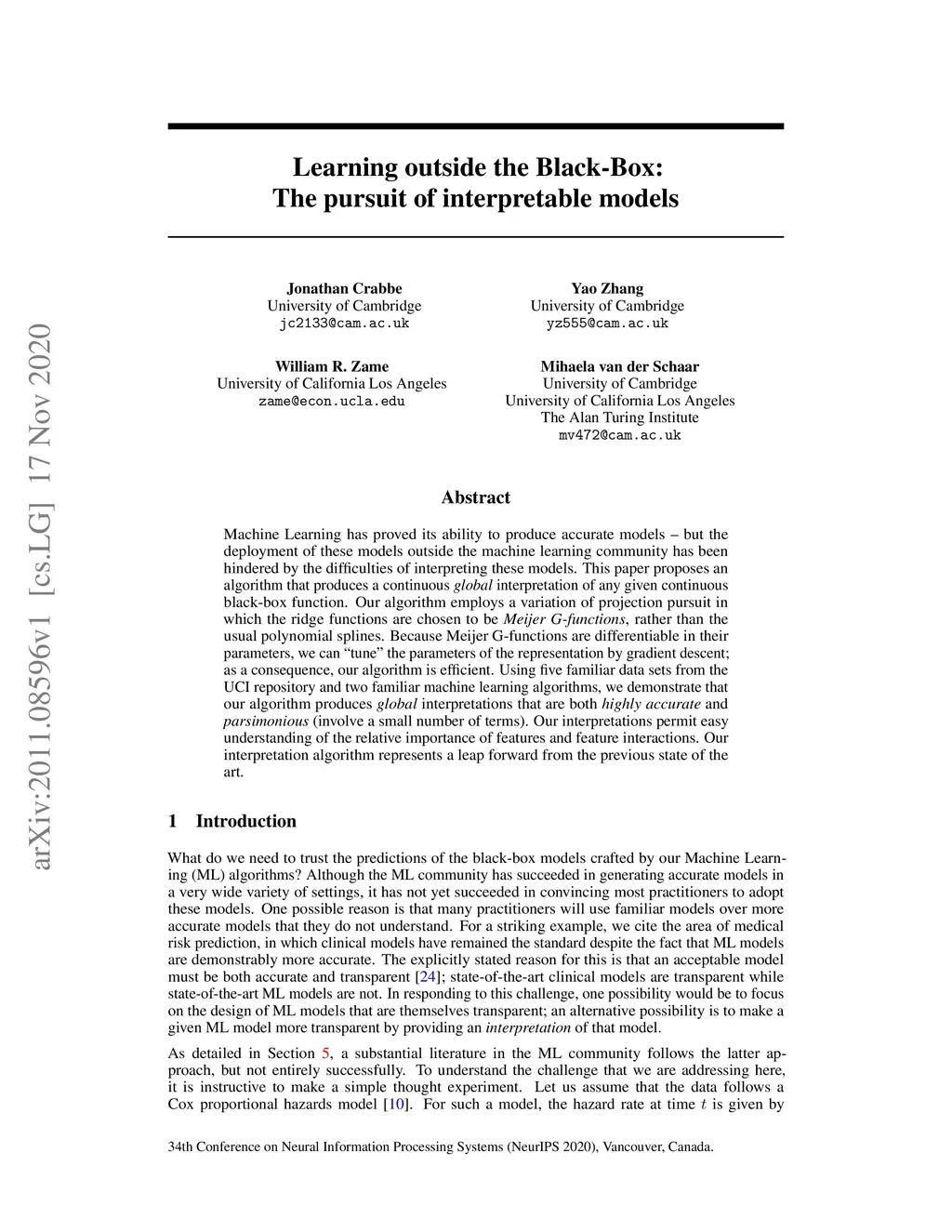 Machine Learning has proved its ability to produce accurate models but the deployment of these models outside the machine learning community has been hindered by the difficulties of interpreting these models. This paper proposes an algorithm that produces a continuous global interpretation of any given continuous black-box function. Our algorithm employs a variation of projection pursuit in which the ridge functions are chosen to be Meijer G-functions, rather than the usual polynomial splines. Because Meijer G-functions are differentiable in their parameters, we can tune the parameters of the representation by gradient descent; as a consequence, our algorithm is efficient. Using five familiar data sets from the UCI repository and two familiar machine learning algorithms, we demonstrate that our algorithm produces global interpretations that are both highly accurate and parsimonious (involve a small number of terms). Our interpretations permit easy understanding of the relative importance of features and feature interactions. Our interpretation algorithm represents a leap forward from the previous state of the art.