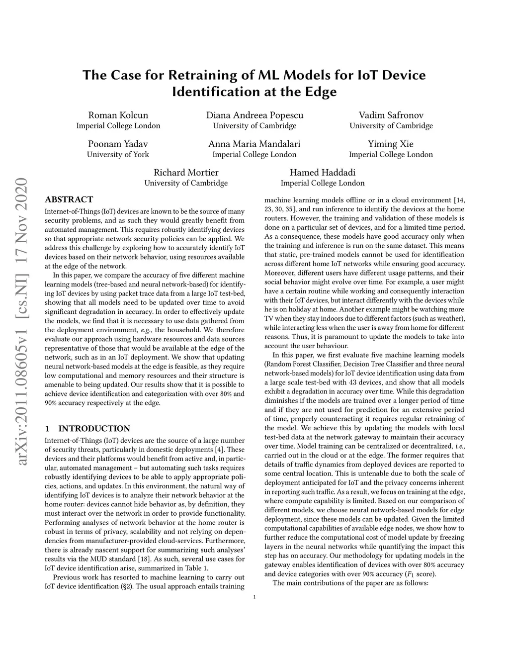 Internet-of-Things (IoT) devices are known to be the source of many security problems, and as such they would greatly benefit from automated management. This requires robustly identifying devices so that appropriate network security policies can be applied. We address this challenge by exploring how to accurately identify IoT devices based on their network behavior, using resources available at the edge of the network. In this paper, we compare the accuracy of five different machine learning models (tree-based and neural network-based) for identifying IoT devices by using packet trace data from a large IoT test-bed, showing that all models need to be updated over time to avoid significant degradation in accuracy. In order to effectively update the models, we find that it is necessary to use data gathered from the deployment environment, e.g., the household. We therefore evaluate our approach using hardware resources and data sources representative of those that would be available at the edge of the network, such as in an IoT deployment. We show that updating neural network-based models at the edge is feasible, as they require low computational and memory resources and their structure is amenable to being updated. Our results show that it is possible to achieve device identification and categorization with over 80% and 90% accuracy respectively at the edge.