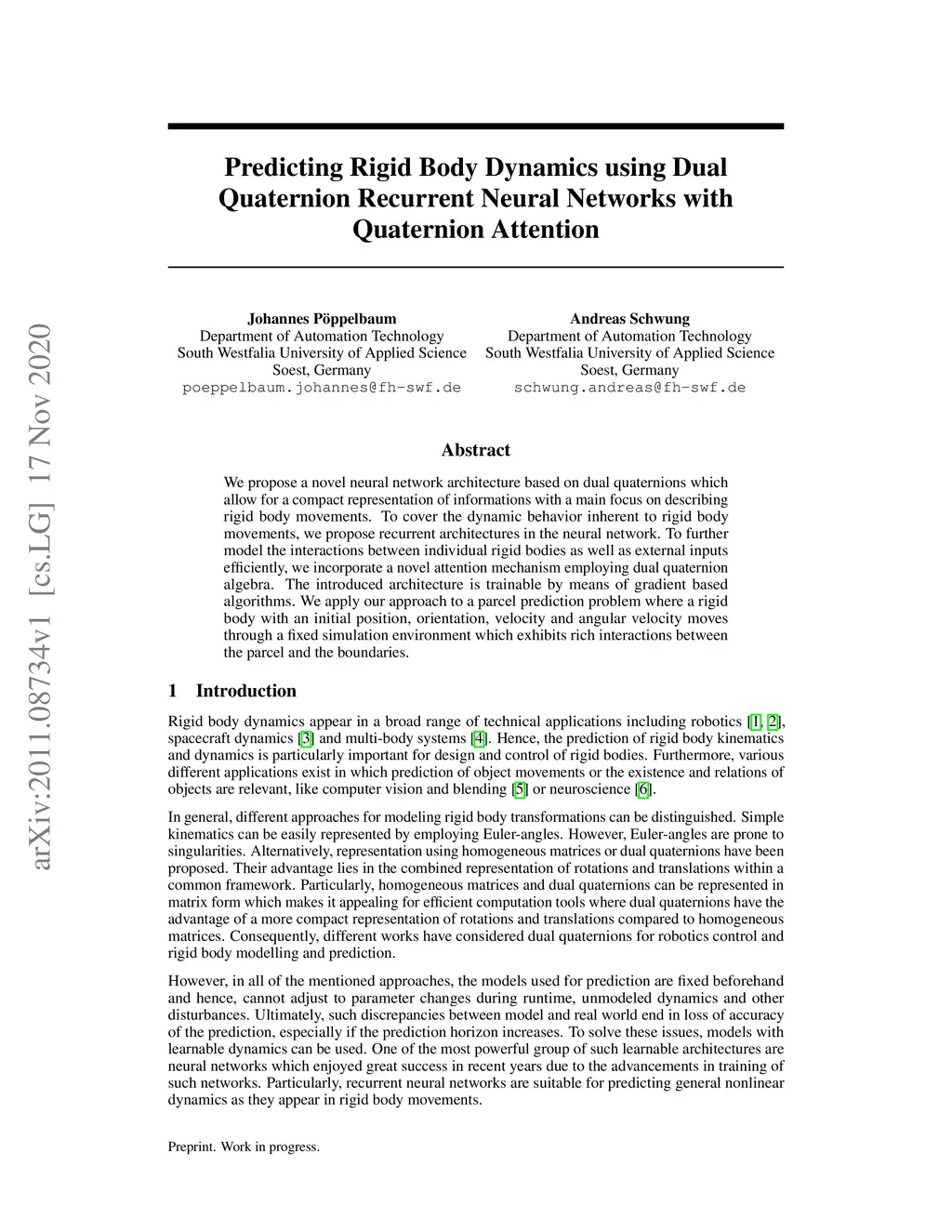 We propose a novel neural network architecture based on dual quaternions which allow for a compact representation of informations with a main focus on describing rigid body movements. To cover the dynamic behavior inherent to rigid body movements, we propose recurrent architectures in the neural network. To further model the interactions between individual rigid bodies as well as external inputs efficiently, we incorporate a novel attention mechanism employing dual quaternion algebra. The introduced architecture is trainable by means of gradient based algorithms. We apply our approach to a parcel prediction problem where a rigid body with an initial position, orientation, velocity and angular velocity moves through a fixed simulation environment which exhibits rich interactions between the parcel and the boundaries.