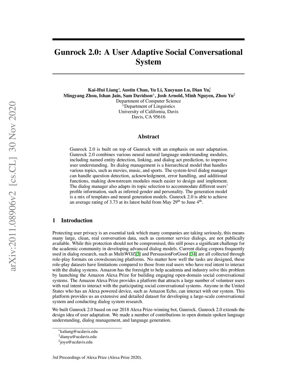 Gunrock 2.0 is built on top of Gunrock with an emphasis on user adaptation. Gunrock 2.0 combines various neural natural language understanding modules, including named entity detection, linking, and dialog act prediction, to improve user understanding. Its dialog management is a hierarchical model that handles various topics, such as movies, music, and sports. The system-level dialog manager can handle question detection, acknowledgment, error handling, and additional functions, making downstream modules much easier to design and implement. The dialog manager also adapts its topic selection to accommodate different users' profile information, such as inferred gender and personality. The generation model is a mix of templates and neural generation models. Gunrock 2.0 is able to achieve an average rating of 3.73 at its latest build from May 29th to June 4th.
