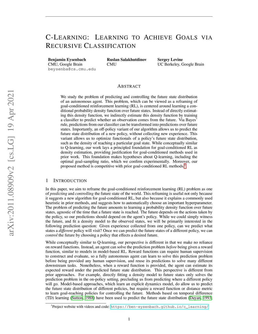 C-Learning: Learning to Achieve Goals via Recursive Classification