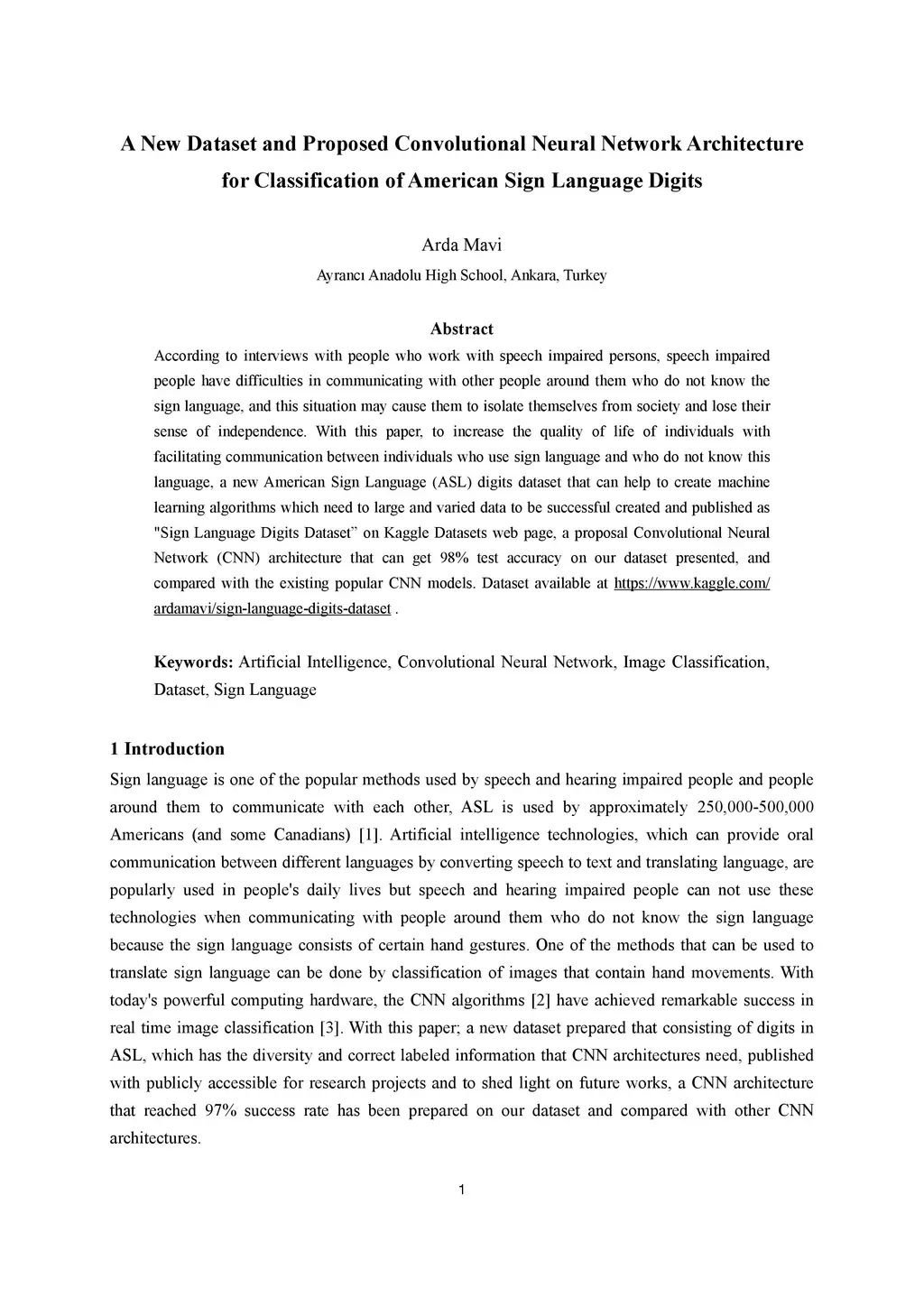 According to interviews with people who work with speech impaired persons, speech impaired people have difficulties in communicating with other people around them who do not know the sign language, and this situation may cause them to isolate themselves from society and lose their sense of independence. With this paper, to increase the quality of life of individuals with facilitating communication between individuals who use sign language and who do not know this language, a new American Sign Language (ASL) digits dataset that can help to create machine learning algorithms which need to large and varied data to be successful created and published as Sign Language Digits Dataset on Kaggle Datasets web page, a proposal Convolutional Neural Network (CNN) architecture that can get 98% test accuracy on our dataset presented, and compared with the existing popular CNN models.