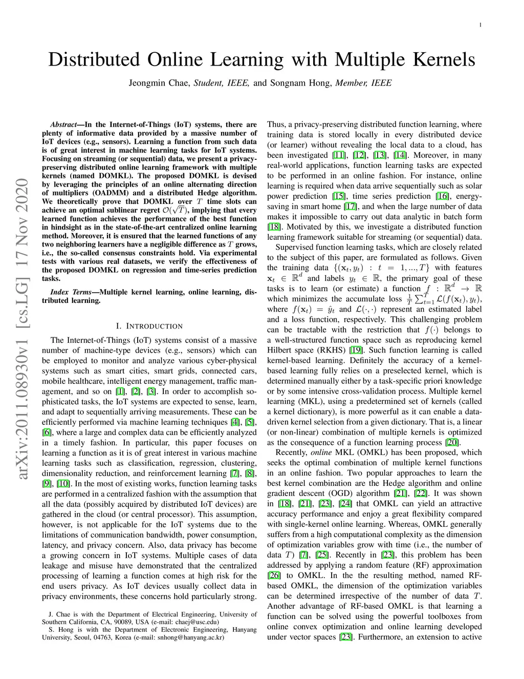 In the Internet-of-Things (IoT) systems, there are plenty of informative data provided by a massive number of IoT devices (e.g., sensors). Learning a function from such data is of great interest in machine learning tasks for IoT systems. Focusing on streaming (or sequential) data, we present a privacy-preserving distributed online learning framework with multiplekernels (named DOMKL). The proposed DOMKL is devised by leveraging the principles of an online alternating direction of multipliers (OADMM) and a distributed Hedge algorithm. We theoretically prove that DOMKL over T time slots can achieve an optimal sublinear regret, implying that every learned function achieves the performance of the best function in hindsight as in the state-of-the-art centralized online learning method. Moreover, it is ensured that the learned functions of any two neighboring learners have a negligible difference as T grows, i.e., the so-called consensus constraints hold. Via experimental tests with various real datasets, we verify the effectiveness of the proposed DOMKL on regression and time-series prediction tasks.