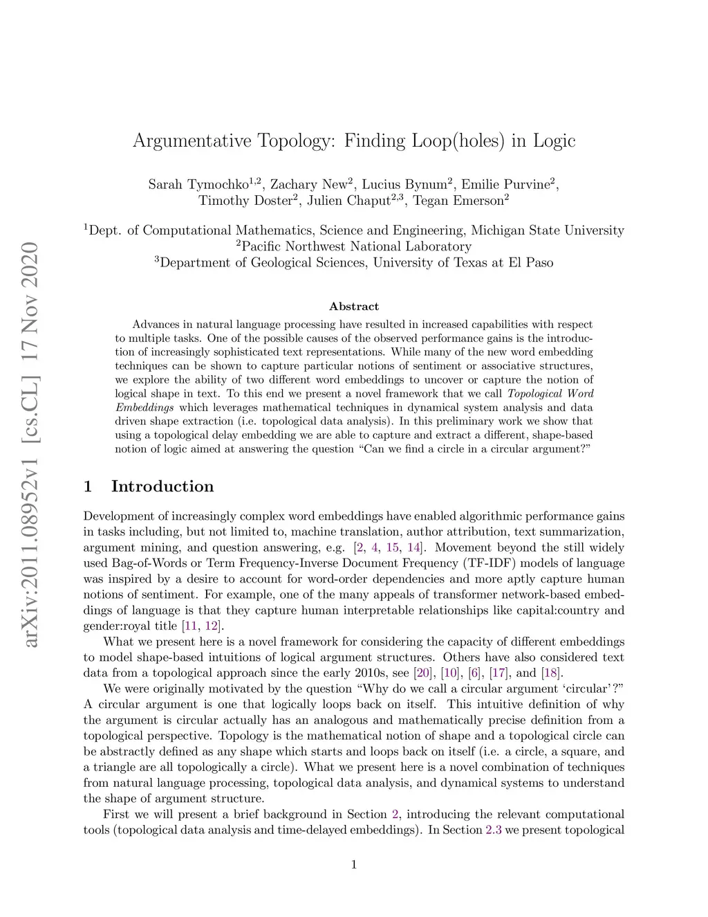 Advances in natural language processing have resulted in increased capabilities with respect to multiple tasks. One of the possible causes of the observed performance gains is the introduction of increasingly sophisticated text representations. While many of the new word embedding techniques can be shown to capture particular notions of sentiment or associative structures, we explore the ability of two different word embeddings to uncover or capture the notion of logical shape in text. To this end we present a novel framework that we call Topological Word Embeddings which leverages mathematical techniques in dynamical system analysis and data driven shape extraction (i.e. topological data analysis). In this preliminary work we show that using a topological delay embedding we are able to capture and extract a different, shape-based notion of logic aimed at answering the question "Can we find a circle in a circular argument?"