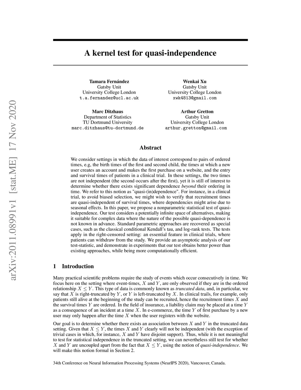 We consider settings in which the data of interest correspond to pairs of ordered times, e.g, the birth times of the first and second child, the times at which a new user creates an account and makes the first purchase on a website, and the entry and survival times of patients in a clinical trial. In these settings, the two times are not independent (the second occurs after the first), yet it is still of interest to determine whether there exists significant dependence {\em beyond} their ordering in time. We refer to this notion as "quasi-(in)dependence". For instance, in a clinical trial, to avoid biased selection, we might wish to verify that recruitment times are quasi-independent of survival times, where dependencies might arise due to seasonal effects. In this paper, we propose a nonparametric statistical test of quasi-independence. Our test considers a potentially infinite space of alternatives, making it suitable for complex data where the nature of the possible quasi-dependence is not known in advance. Standard parametric approaches are recovered as special cases, such as the classical conditional Kendall's tau, and log-rank tests. The tests apply in the right-censored setting: an essential feature in clinical trials, where patients can withdraw from the study. We provide an asymptotic analysis of our test-statistic, and demonstrate in experiments that our test obtains better power than existing approaches, while being more computationally efficient.