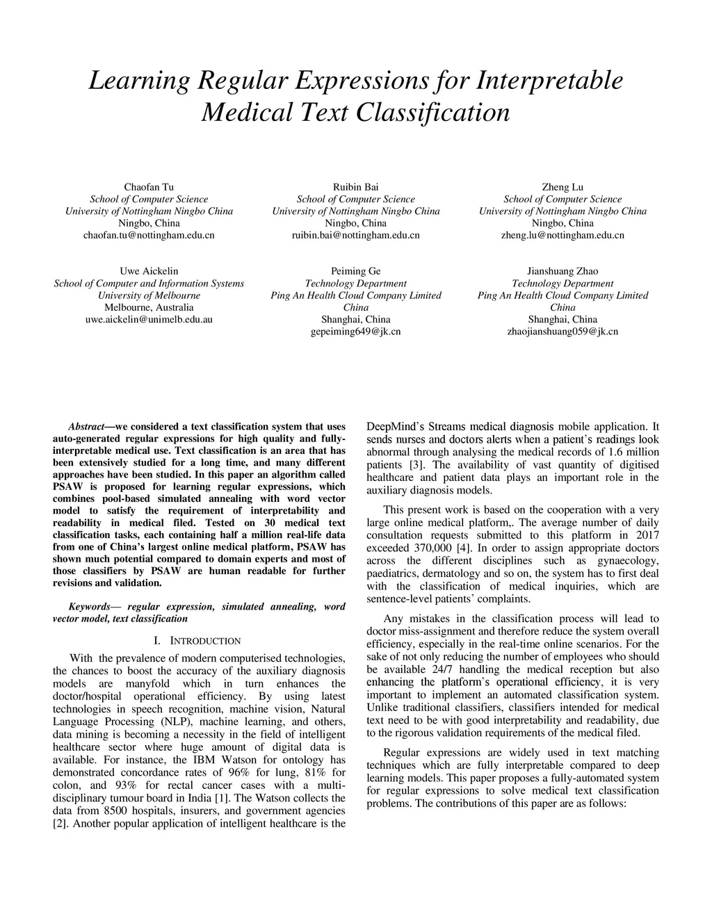 In this paper, we propose a rule-based engine composed of high quality and interpretable regular expressions for medical text classification. The regular expressions are auto generated by a constructive heuristic method and optimized using a Pool-based Simulated Annealing (PSA) approach. Although existing Deep Neural Network (DNN) methods present high quality performance in most Natural Language Processing (NLP) applications, the solutions are regarded as uninterpretable black boxes to humans. Therefore, rule-based methods are often introduced when interpretable solutions are needed, especially in the medical field. However, the construction of regular expressions can be extremely labor-intensive for large data sets. This research aims to reduce the manual efforts while maintaining high-quality solutions