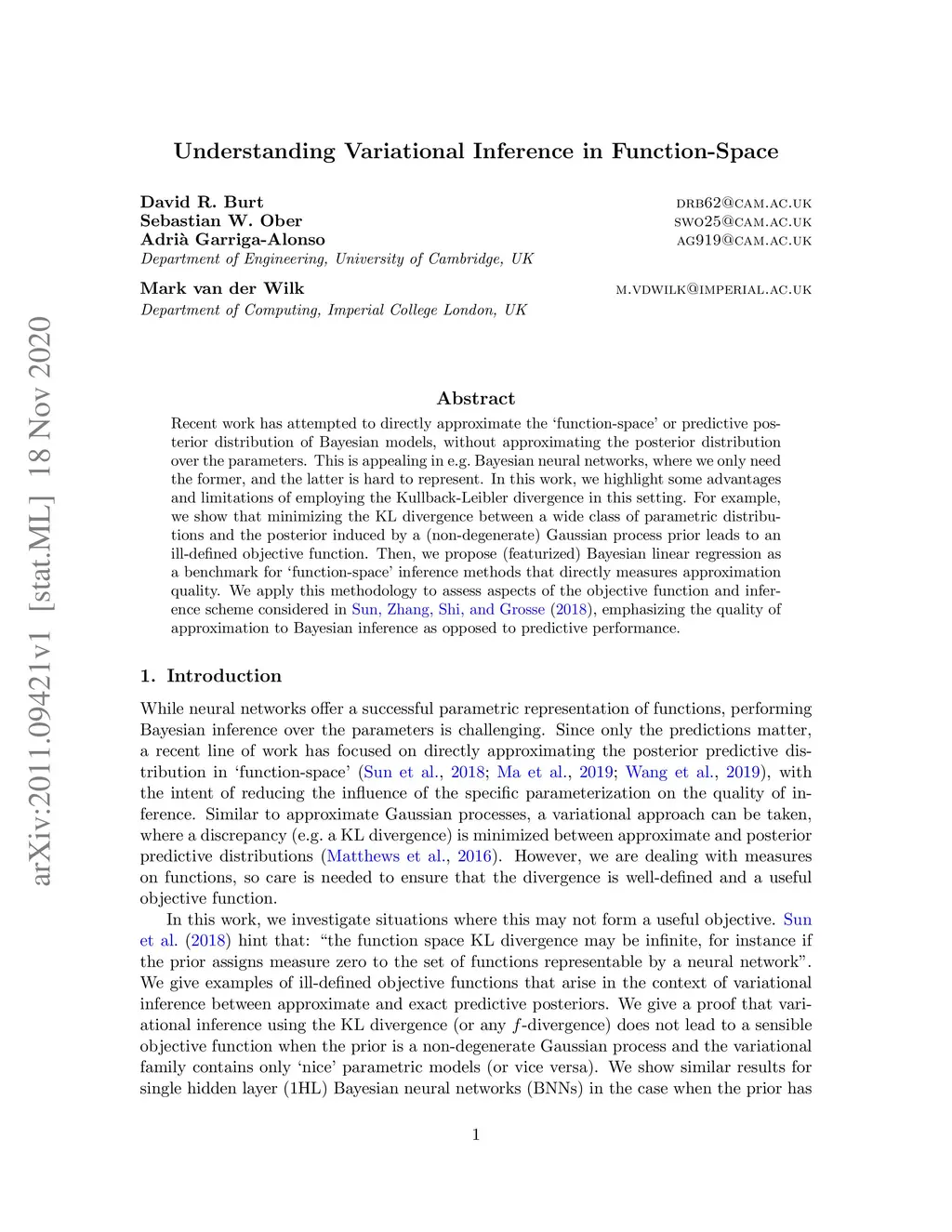Recent work has attempted to directly approximate the `function-space' or predictive posterior distribution of Bayesian models, without approximating the posterior distribution over the parameters. This is appealing in e.g. Bayesian neural networks, where we only need the former, and the latter is hard to represent. In this work, we highlight some advantages and limitations of employing the Kullback-Leibler divergence in this setting. For example, we show that minimizing the KL divergence between a wide class of parametric distributions and the posterior induced by a (non-degenerate) Gaussian process prior leads to an ill-defined objective function. Then, we propose (featurized) Bayesian linear regression as a benchmark for `function-space' inference methods that directly measures approximation quality. We apply this methodology to assess aspects of the objective function and inference scheme considered in Sun, Zhang, Shi, and Grosse (2018), emphasizing the quality of approximation to Bayesian inference as opposed to predictive performance.