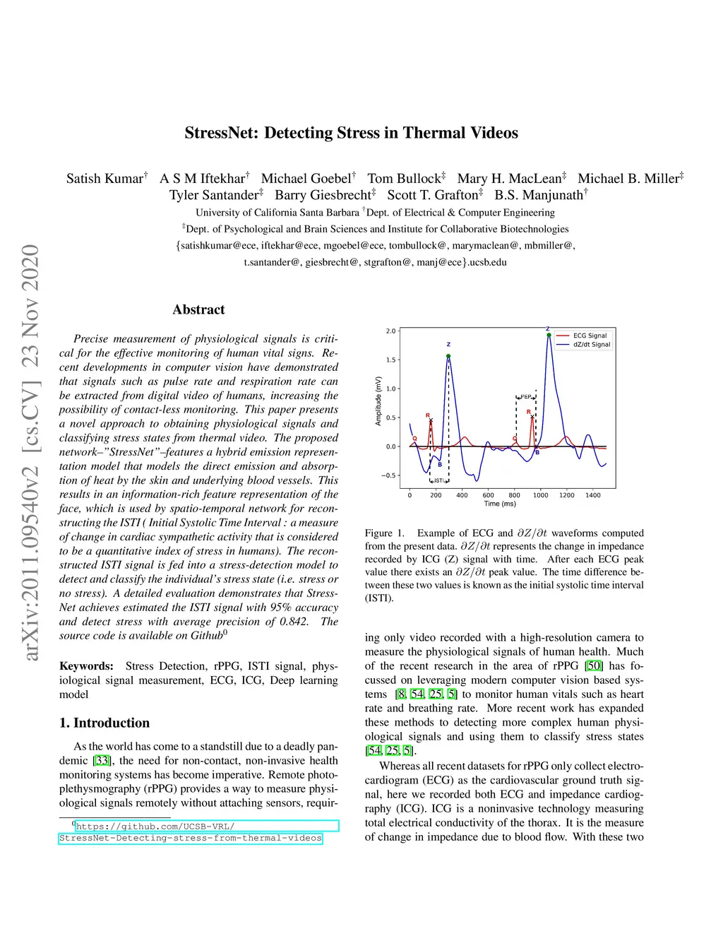Precise measurement of physiological signals is critical for the effective monitoring of human vital signs. Recent developments in computer vision have demonstrated that signals such as pulse rate and respiration rate can be extracted from digital video of humans, increasing the possibility of contact-less monitoring. This paper presents a novel approach to obtaining physiological signals and classifying stress states from thermal video. The proposed network--"StressNet"--features a hybrid emission representation model that models the direct emission and absorption of heat by the skin and underlying blood vessels. This results in an information-rich feature representation of the face, which is used by spatio-temporal network for reconstructing the ISTI ( Initial Systolic Time Interval: a measure of change in cardiac sympathetic activity that is considered to be a quantitative index of stress in humans ). The reconstructed ISTI signal is fed into a stress-detection model to detect and classify the individual's stress state ( i.e. stress or no stress ). A detailed evaluation demonstrates that StressNet achieves estimated the ISTI signal with 95% accuracy and detect stress with average precision of 0.842. The source code is available on Github.