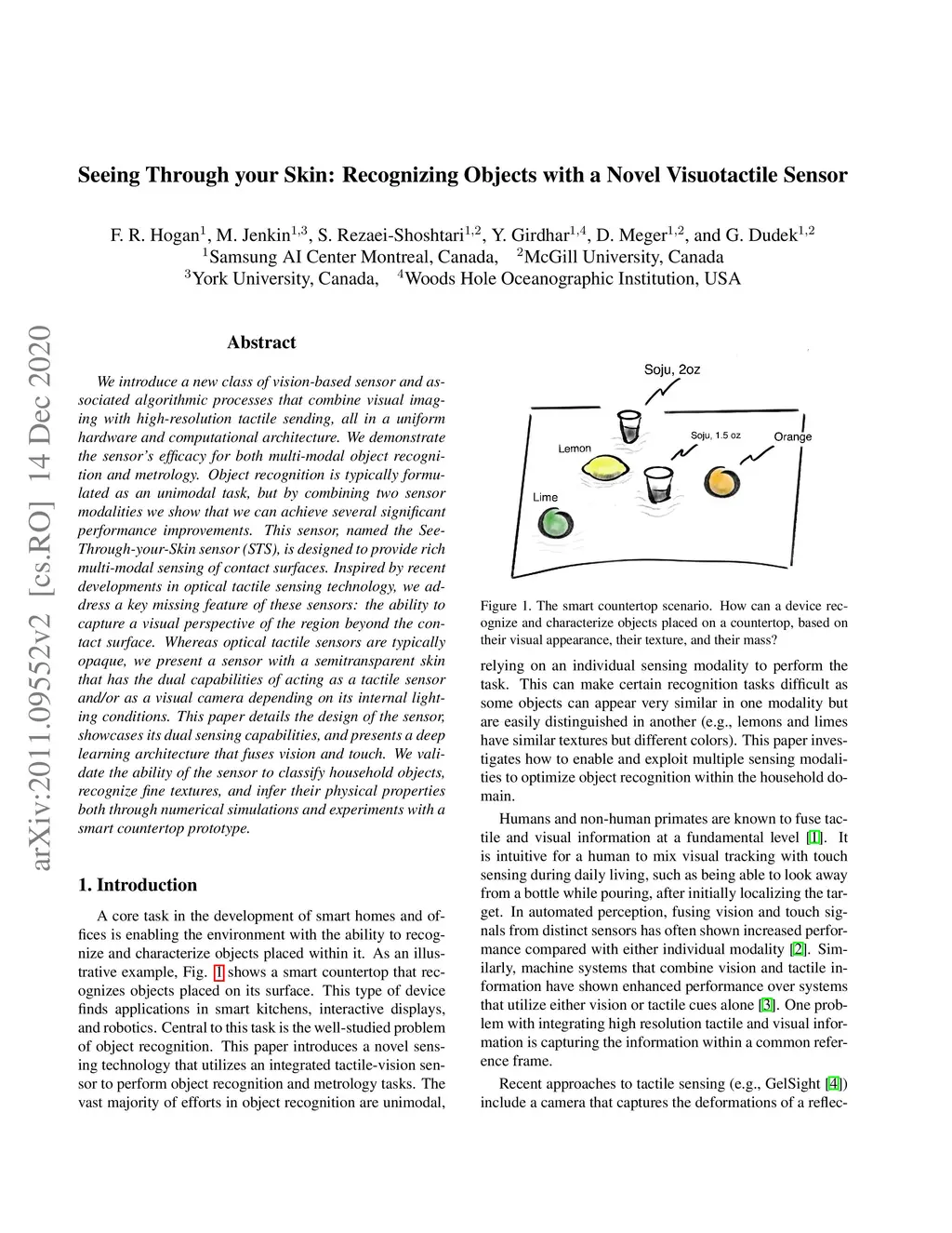 We introduce a new class of vision-based sensor and associated algorithmic processes that combine visual imaging with high-resolution tactile sending, all in a uniform hardware and computational architecture. We demonstrate the sensor's efficacy for both multi-modal object recognition and metrology. Object recognition is typically formulated as an unimodal task, but by combining two sensor modalities we show that we can achieve several significant performance improvements. This sensor, named the See-Through-your-Skin sensor (STS), is designed to provide rich multi-modal sensing of contact surfaces. Inspired by recent developments in optical tactile sensing technology, we address a key missing feature of these sensors: the ability to capture a visual perspective of the region beyond the contact surface. Whereas optical tactile sensors are typically opaque, we present a sensor with a semitransparent skin that has the dual capabilities of acting as a tactile sensor and/or as a visual camera depending on its internal lighting conditions. This paper details the design of the sensor, showcases its dual sensing capabilities, and presents a deep learning architecture that fuses vision and touch. We validate the ability of the sensor to classify household objects, recognize fine textures, and infer their physical properties both through numerical simulations and experiments with a smart countertop prototype.