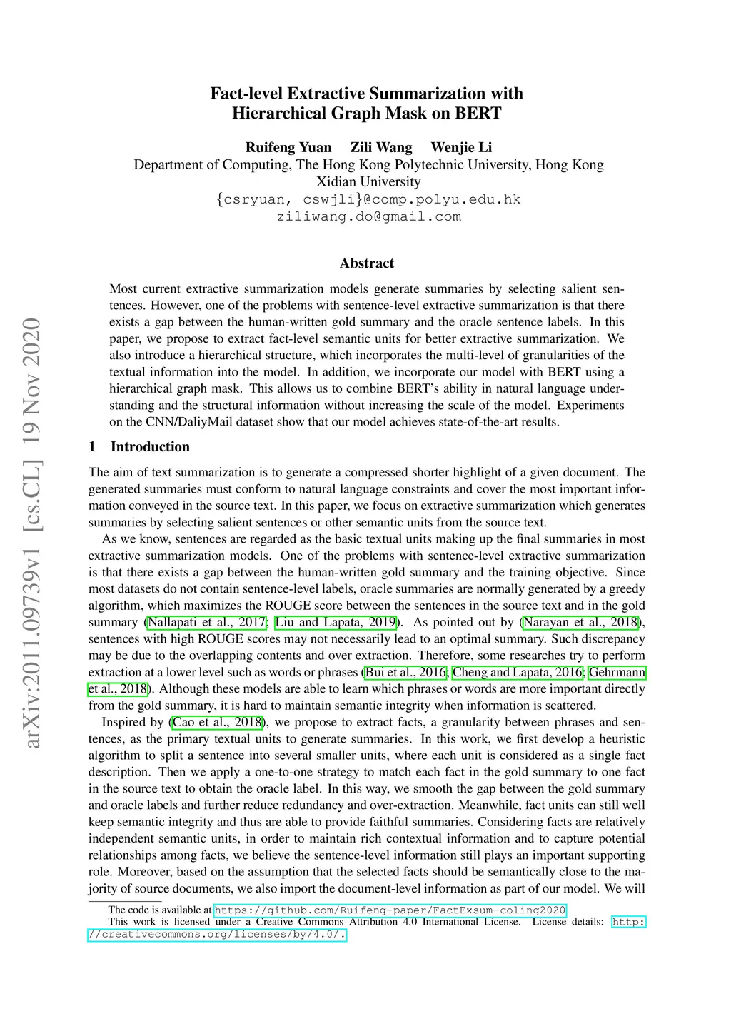 Fact-level Extractive Summarization with Hierarchical Graph Mask on BERT