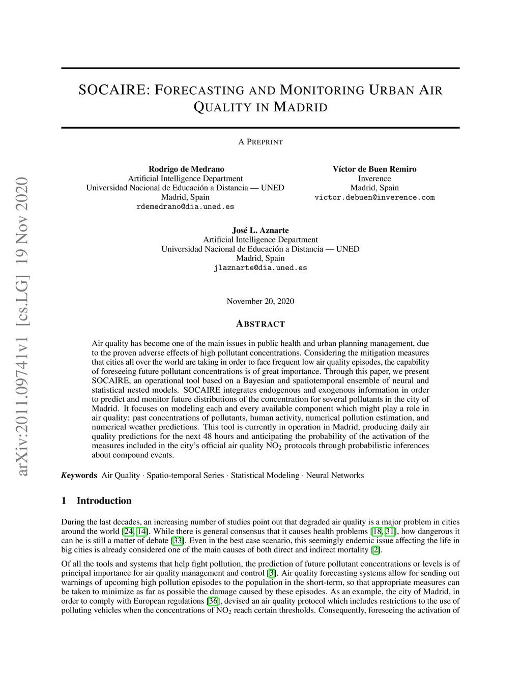 Air quality has become one of the main issues in public health and urban planning management, due to the proven adverse effects of high pollutant concentrations. Considering the mitigation measures that cities all over the world are taking in order to face frequent low air quality episodes, the capability of foreseeing future pollutant concentrations is of great importance. Through this paper, we present SOCAIRE, an operational tool based on a Bayesian and spatiotemporal ensemble of neural and statistical nested models. SOCAIRE integrates endogenous and exogenous information in order to predict and monitor future distributions of the concentration for several pollutants in the city of Madrid. It focuses on modeling each and every available component which might play a role in air quality: past concentrations of pollutants, human activity, numerical pollution estimation, and numerical weather predictions. This tool is currently in operation in Madrid, producing daily air quality predictions for the next 48 hours and anticipating the probability of the activation of the measures included in the city's official air quality \no protocols through probabilistic inferences about compound events.