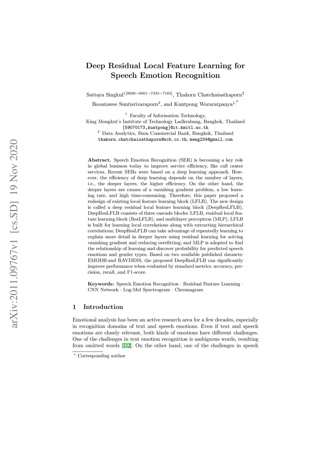 Deep Residual Local Feature Learning for Speech Emotion Recognition
