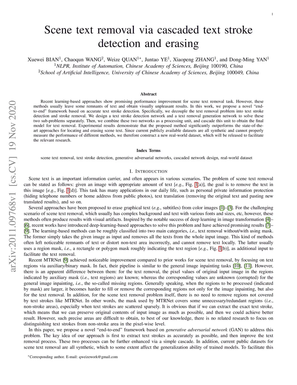 Scene text removal via cascaded text stroke detection and erasing