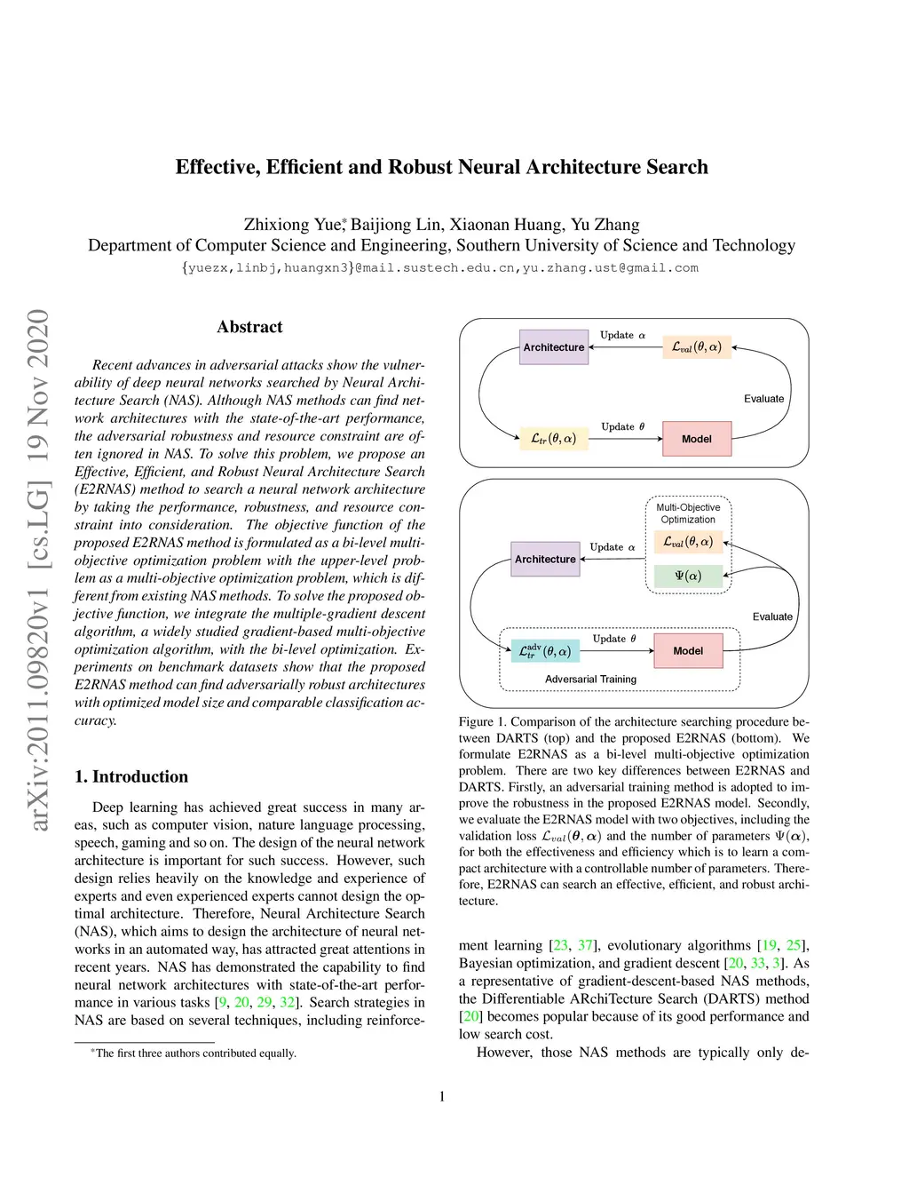 Recent advances in adversarial attacks show the vulnerability of deep neural networks searched by Neural Architecture Search (NAS). Although NAS methods can find network architectures with the state-of-the-art performance, the adversarial robustness and resource constraint are often ignored in NAS. To solve this problem, we propose an Effective, Efficient, and Robust Neural Architecture Search (E2RNAS) method to search a neural network architecture by taking the performance, robustness, and resource constraint into consideration. The objective function of the proposed E2RNAS method is formulated as a bi-level multi-objective optimization problem with the upper-level problem as a multi-objective optimization problem, which is different from existing NAS methods. To solve the proposed objective function, we integrate the multiple-gradient descent algorithm, a widely studied gradient-based multi-objective optimization algorithm, with the bi-level optimization. Experiments on benchmark datasets show that the proposed E2RNAS method can find adversarially robust architectures with optimized model size and comparable classification accuracy.