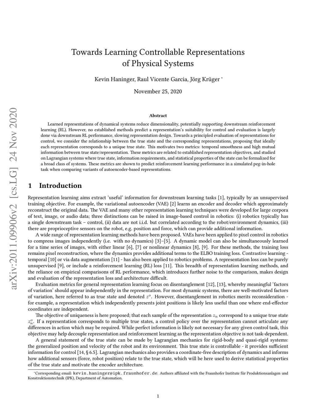Learned representations of dynamical systems reduce dimensionality, potentially supporting downstream reinforcement learning (RL). However, no established methods predict a representation's suitability for control and evaluation is largely done via downstream RL performance, slowing representation design. Towards a principled evaluation of representations for control, we consider the relationship between the true state and the corresponding representations, proposing that ideally each representation corresponds to a unique true state. This motivates two metrics: temporal smoothness and high mutual information between true state/representation. These metrics are related to established representation objectives, and studied on Lagrangian systems where true state, information requirements, and statistical properties of the state can be formalized for a broad class of systems. These metrics are shown to predict reinforcement learning performance in a simulated peg-in-hole task when comparing variants of autoencoder-based representations.