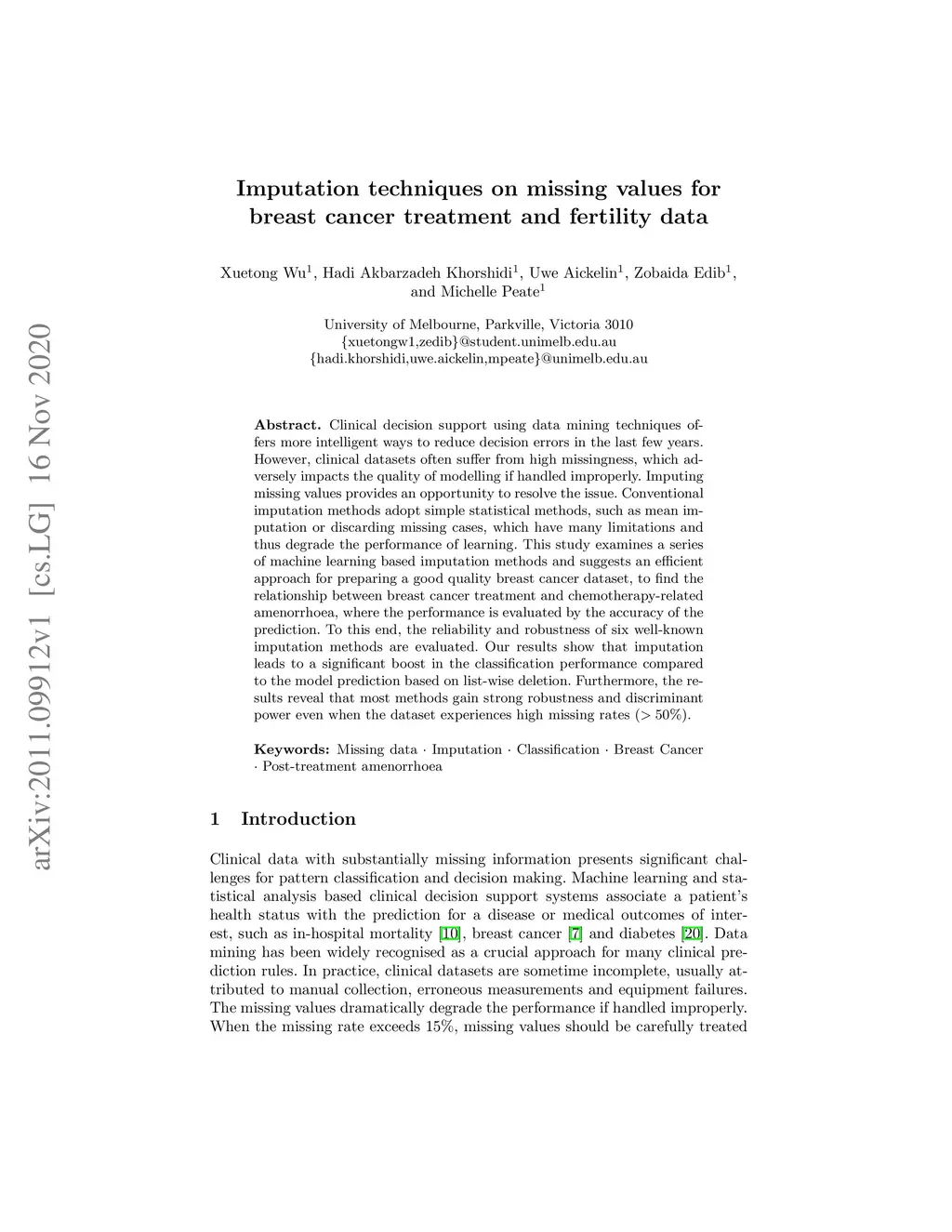 Imputation techniques on missing values in breast cancer treatment and