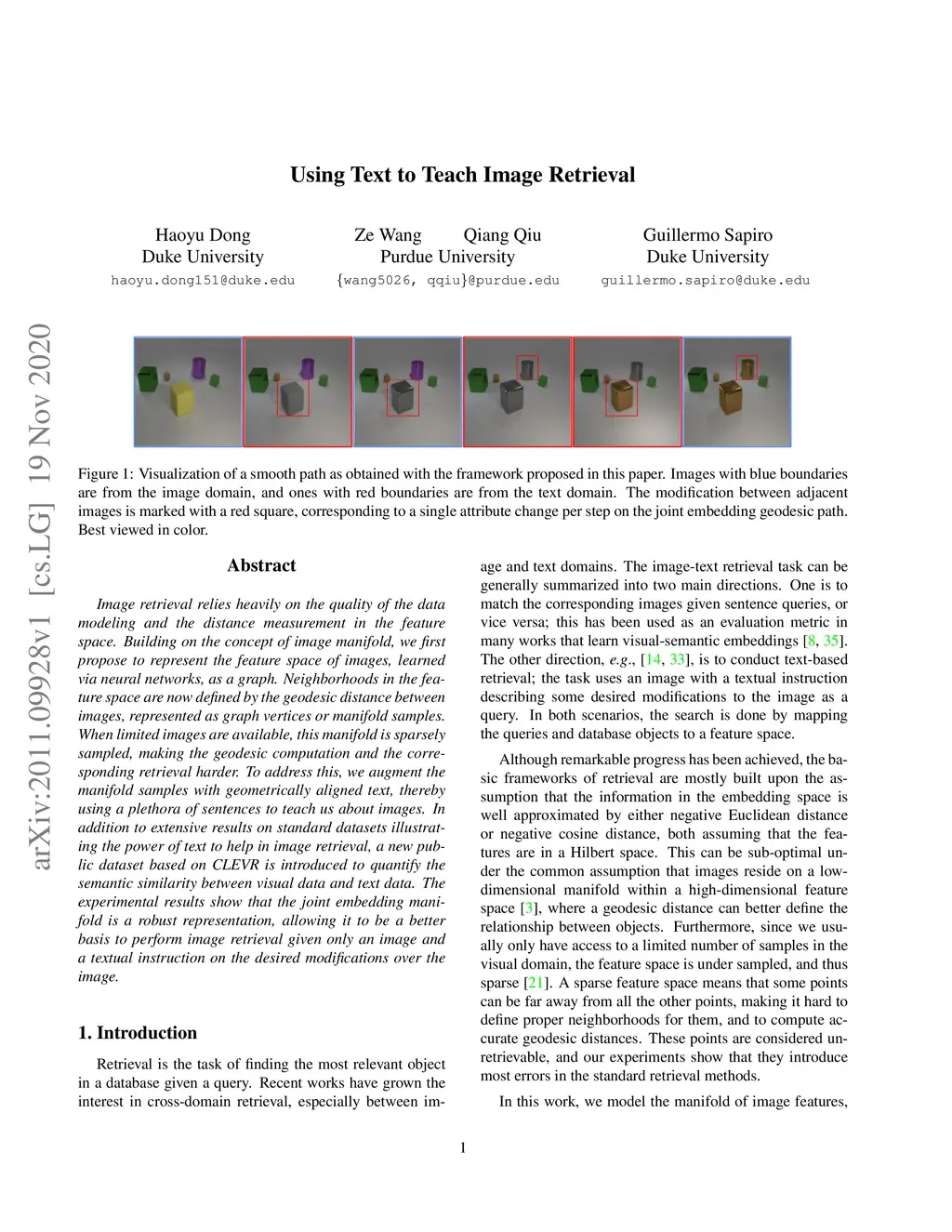 Image retrieval relies heavily on the quality of the data modeling and the distance measurement in the feature space. Building on the concept of image manifold, we first propose to represent the feature space of images, learned via neural networks, as a graph. Neighborhoods in the feature space are now defined by the geodesic distance between images, represented as graph vertices or manifold samples. When limited images are available, this manifold is sparsely sampled, making the geodesic computation and the corresponding retrieval harder. To address this, we augment the manifold samples with geometrically aligned text, thereby using a plethora of sentences to teach us about images. In addition to extensive results on standard datasets illustrating the power of text to help in image retrieval, a new public dataset based on CLEVR is introduced to quantify the semantic similarity between visual data and text data. The experimental results show that the joint embedding manifold is a robust representation, allowing it to be a better basis to perform image retrieval given only an image and a textual instruction on the desired modifications over the image