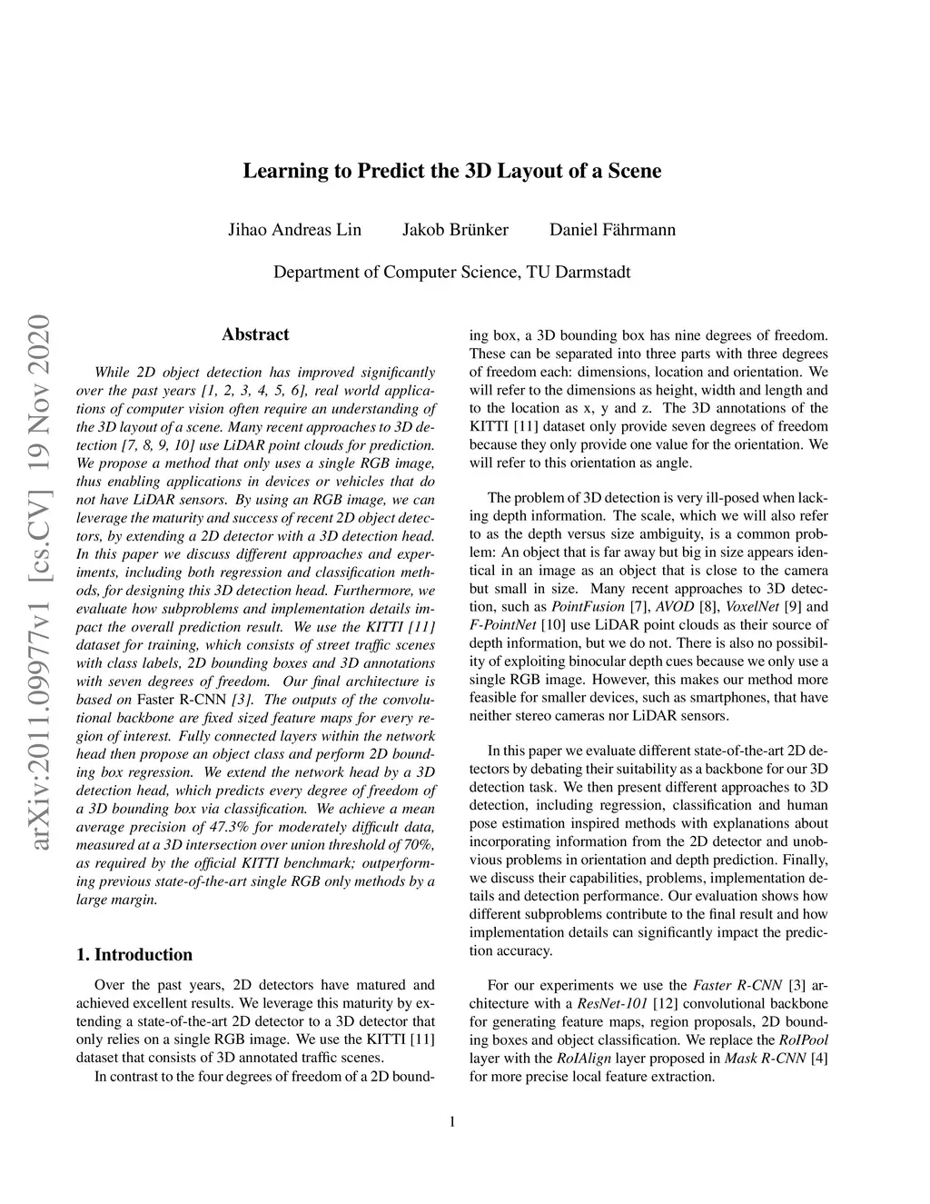 While 2D object detection has improved significantly over the past, real world applications of computer vision often require an understanding of the 3D layout of a scene. Many recent approaches to 3D detection use LiDAR point clouds for prediction. We propose a method that only uses a single RGB image, thus enabling applications in devices or vehicles that do not have LiDAR sensors. By using an RGB image, we can leverage the maturity and success of recent 2D object detectors, by extending a 2D detector with a 3D detection head. In this paper we discuss different approaches and experiments, including both regression and classification methods, for designing this 3D detection head. Furthermore, we evaluate how subproblems and implementation details impact the overall prediction result. We use the KITTI dataset for training, which consists of street traffic scenes with class labels, 2D bounding boxes and 3D annotations with seven degrees of freedom. Our final architecture is based on Faster R-CNN. The outputs of the convolutional backbone are fixed sized feature maps for every region of interest. Fully connected layers within the network head then propose an object class and perform 2D bounding box regression. We extend the network head by a 3D detection head, which predicts every degree of freedom of a 3D bounding box via classification. We achieve a mean average precision of 47.3% for moderately difficult data, measured at a 3D intersection over union threshold of 70%, as required by the official KITTI benchmark; outperforming previous state-of-the-art single RGB only methods by a large margin.