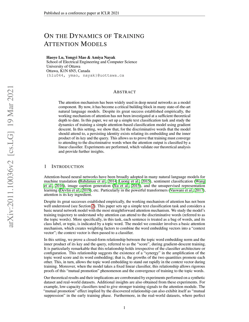 The attention mechanism has been widely used in deep neural networks as a model component. By now, it has become a critical building block in many state-of-the-art natural language models. Despite its great success established empirically, the working mechanism of attention has not been investigated at a sufficient theoretical depth to date. In this paper, we set up a simple text classification task and study the dynamics of training a simple attention-based classification model using gradient descent. In this setting, we show that, for the discriminative words that the model should attend to, a persisting identity exists relating its embedding and the inner product of its key and the query. This allows us to prove that training must converge to attending to the discriminative words when the attention output is classified by a linear classifier. Experiments are performed, which validate our theoretical analysis and provide further insights.