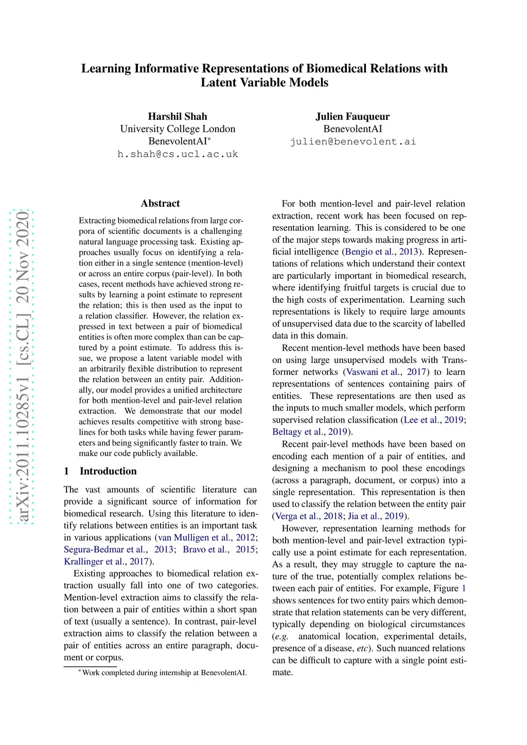 Extracting biomedical relations from large corpora of scientific documents is a challenging natural language processing task. Existing approaches usually focus on identifying a relation either in a single sentence (mention-level) or across an entire corpus (pair-level). In both cases, recent methods have achieved strong results by learning a point estimate to represent the relation; this is then used as the input to a relation classifier. However, the relation expressed in text between a pair of biomedical entities is often more complex than can be captured by a point estimate. To address this issue, we propose a latent variable model with an arbitrarily flexible distribution to represent the relation between an entity pair. Additionally, our model provides a unified architecture for both mention-level and pair-level relation extraction. We demonstrate that our model achieves results competitive with strong baselines for both tasks while having fewer parameters and being significantly faster to train. We make our code publicly available.
