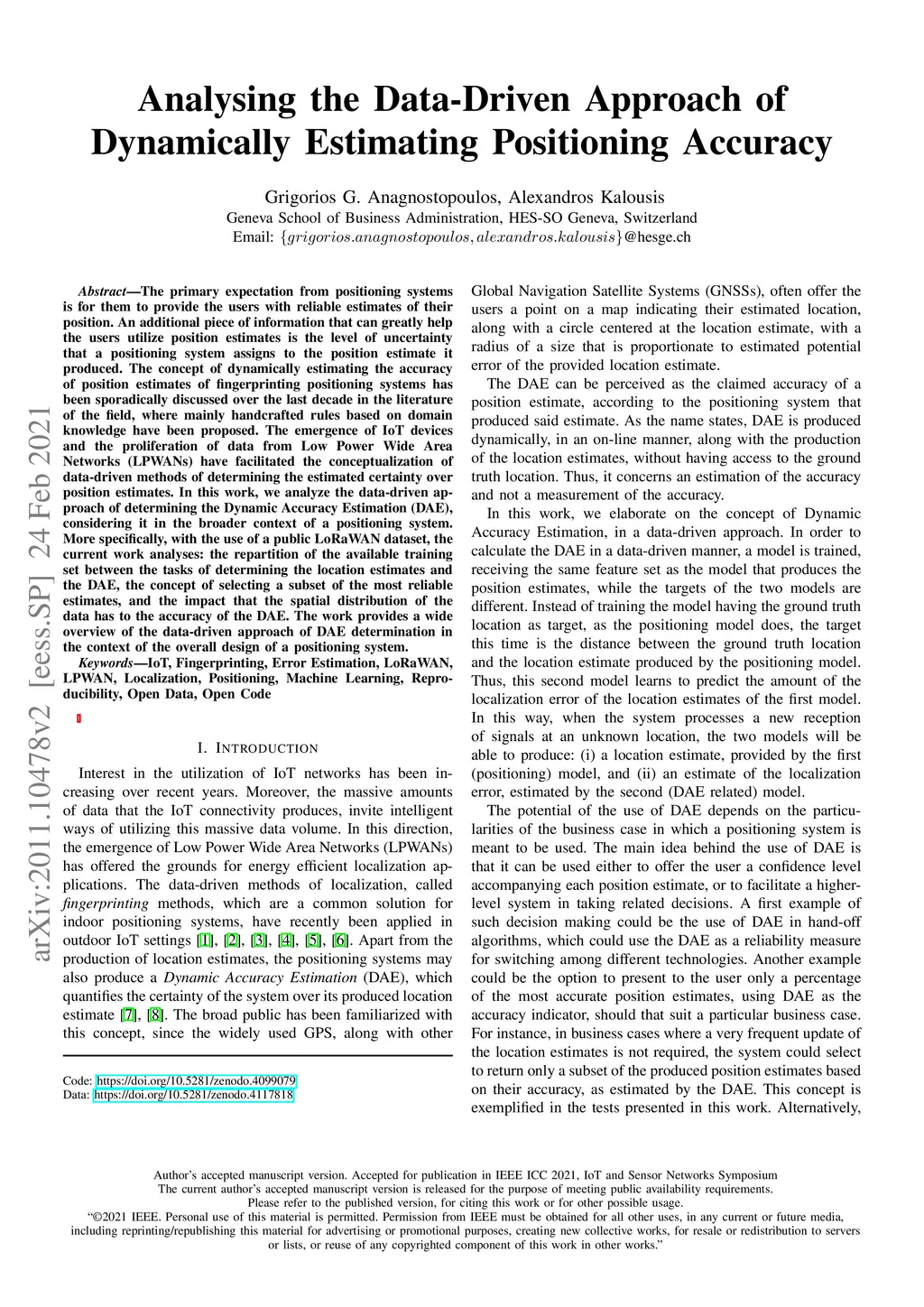 The primary expectation from positioning systems is for them to provide the users with reliable estimates of their position. An additional piece of information that can greatly help the users utilize position estimates is the level of uncertainty that a positioning system assigns to the position estimate it produced. The concept of dynamically estimating the accuracy of position estimates of fingerprinting positioning systems has been sporadically discussed over the last decade in the literature of the field, where mainly handcrafted rules based on domain knowledge have been proposed. The emergence of IoT devices and the proliferation of data from Low Power Wide Area Networks (LPWANs) have facilitated the conceptualization of data-driven methods of determining the estimated certainty over position estimates. In this work, we analyze the data-driven approach of determining the Dynamic Accuracy Estimation (DAE), considering it in the broader context of a positioning system. More specifically, with the use of a public LoRaWAN dataset, the current work analyses: the repartition of the available training set between the tasks of determining the location estimates and the DAE, the concept of selecting a subset of the most reliable estimates, and the impact that the spatial distribution of the data has to the accuracy of the DAE. The work provides a wide overview of the data-driven approach of DAE determination in the context of the overall design of a positioning system.