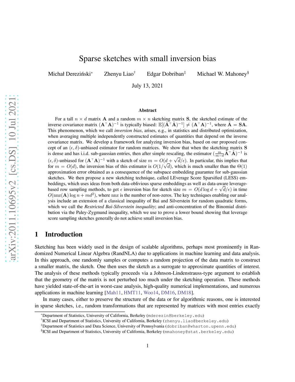 For a tall matrix and a random sketching matrix , the sketched estimate of the inverse covariance matrix is typically biased: , where . This phenomenon, which we call inversion bias, arises, e.g., in statistics and distributed optimization, when averaging multiple independently constructed estimates of quantities that depend on the inverse covariance. We develop a framework for analyzing inversion bias, based on our proposed concept of an -unbiased estimator for random matrices. We show that when the sketching matrix is dense and has i.i.d. sub-gaussian entries, then after simple rescaling, the estimator is -unbiased for with a sketch of size . This implies that for , the inversion bias of this estimator is , which is much smaller than the approximation error obtained as a consequence of the subspace embedding guarantee for sub-gaussian sketches. We then propose a new sketching technique, called LEverage Score Sparsified (LESS) embeddings, which uses ideas from both data-oblivious sparse embeddings as well as data-aware leverage-based row sampling methods, to get inversion bias for sketch size in time , where nnz is the number of non-zeros. The key techniques enabling our analysis include an extension of a classical inequality of Bai and Silverstein for random quadratic forms, which we call the Restricted Bai-Silverstein inequality; and anti-concentration of the Binomial distribution via the Paley-Zygmund inequality, which we use to prove a lower bound showing that leverage score sampling sketches generally do not achieve small inversion bias.
