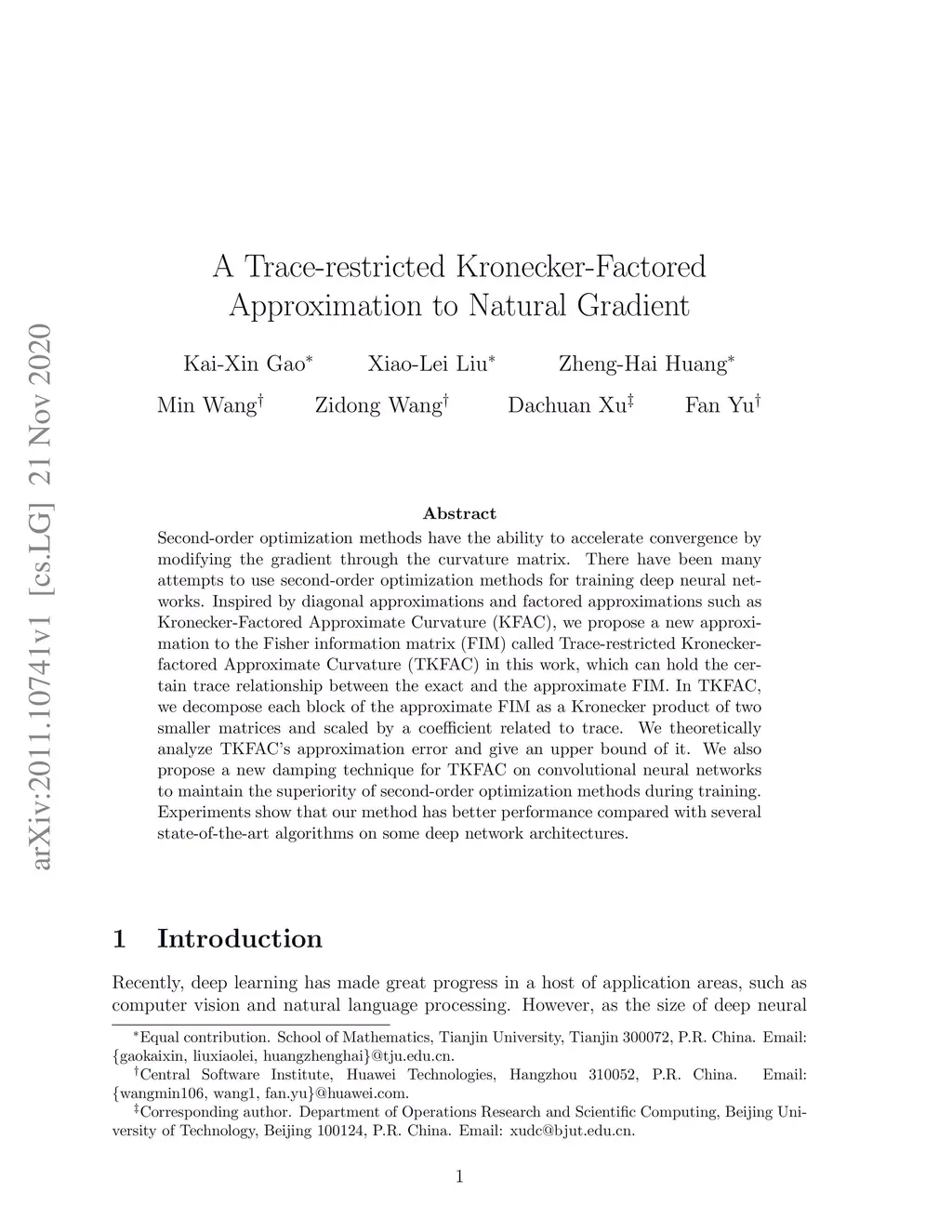 Second-order optimization methods have the ability to accelerate convergence by modifying the gradient through the curvature matrix. There have been many attempts to use second-order optimization methods for training deep neural networks. Inspired by diagonal approximations and factored approximations such as Kronecker-Factored Approximate Curvature (KFAC), we propose a new approximation to the Fisher information matrix (FIM) called Trace-restricted Kronecker-factored Approximate Curvature (TKFAC) in this work, which can hold the certain trace relationship between the exact and the approximate FIM. In TKFAC, we decompose each block of the approximate FIM as a Kronecker product of two smaller matrices and scaled by a coefficient related to trace. We theoretically analyze TKFAC's approximation error and give an upper bound of it. We also propose a new damping technique for TKFAC on convolutional neural networks to maintain the superiority of second-order optimization methods during training. Experiments show that our method has better performance compared with several state-of-the-art algorithms on some deep network architectures.