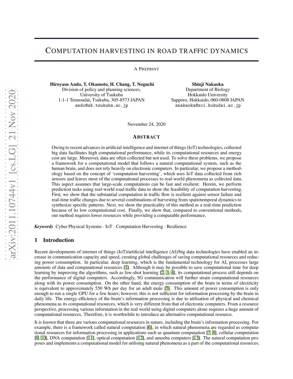 Owing to recent advances in artificial intelligence and internet of things (IoT) technologies, collected big data facilitates high computational performance, while its computational resources and energy cost are large. Moreover, data are often collected but not used. To solve these problems, we propose a framework for a computational model that follows a natural computational system, such as the human brain, and does not rely heavily on electronic computers. In particular, we propose a methodology based on the concept of `computation harvesting', which uses IoT data collected from rich sensors and leaves most of the computational processes to real-world phenomena as collected data. This aspect assumes that large-scale computations can be fast and resilient. Herein, we perform prediction tasks using real-world road traffic data to show the feasibility of computation harvesting. First, we show that the substantial computation in traffic flow is resilient against sensor failure and real-time traffic changes due to several combinations of harvesting from spatiotemporal dynamics to synthesize specific patterns. Next, we show the practicality of this method as a real-time prediction because of its low computational cost. Finally, we show that, compared to conventional methods, our method requires lower resources while providing a comparable performance.