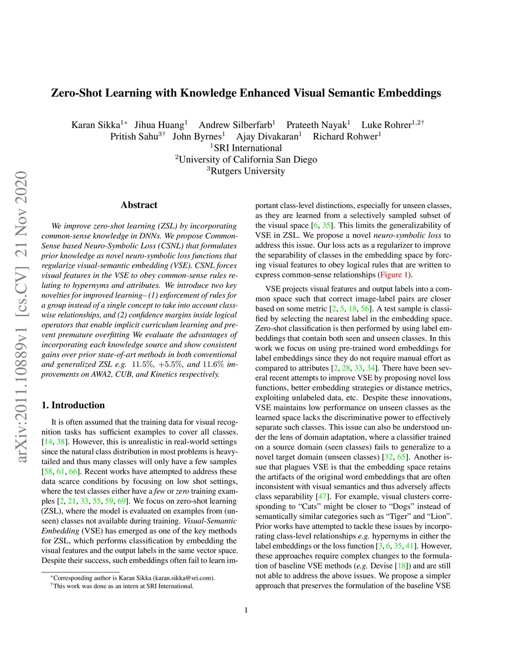 We improve zero-shot learning (ZSL) by incorporating common-sense knowledge in DNNs. We propose Common-Sense based Neuro-Symbolic Loss (CSNL) that formulates prior knowledge as novel neuro-symbolic loss functions that regularize visual-semantic embedding. CSNL forces visual features in the VSE to obey common-sense rules relating to hypernyms and attributes. We introduce two key novelties for improved learning: (1) enforcement of rules for a group instead of a single concept to take into account class-wise relationships, and (2) confidence margins inside logical operators that enable implicit curriculum learning and prevent premature overfitting. We evaluate the advantages of incorporating each knowledge source and show consistent gains over prior state-of-art methods in both conventional and generalized ZSL e.g. 11.5%, 5.5%, and 11.6% improvements on AWA2, CUB, and Kinetics respectively.