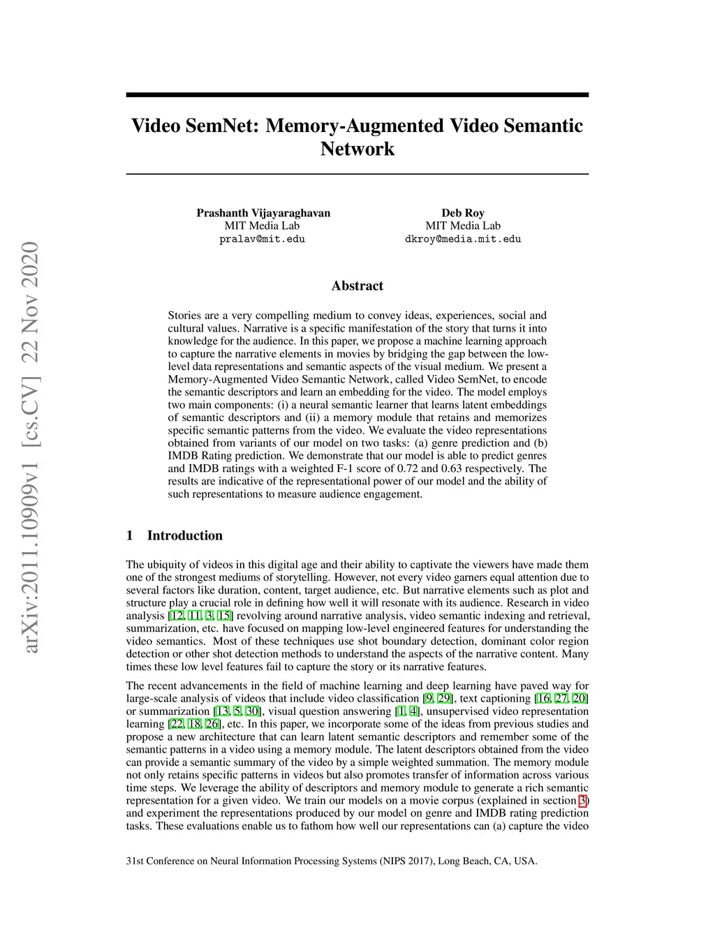 Stories are a very compelling medium to convey ideas, experiences, social and cultural values. Narrative is a specific manifestation of the story that turns it into knowledge for the audience. In this paper, we propose a machine learning approach to capture the narrative elements in movies by bridging the gap between the low-level data representations and semantic aspects of the visual medium. We present a Memory-Augmented Video Semantic Network, called Video SemNet, to encode the semantic descriptors and learn an embedding for the video. The model employs two main components: (i) a neural semantic learner that learns latent embeddings of semantic descriptors and (ii) a memory module that retains and memorizes specific semantic patterns from the video. We evaluate the video representations obtained from variants of our model on two tasks: (a) genre prediction and (b) IMDB Rating prediction. We demonstrate that our model is able to predict genres and IMDB ratings with a weighted F-1 score of 0.72 and 0.63 respectively. The results are indicative of the representational power of our model and the ability of such representations to measure audience engagement.